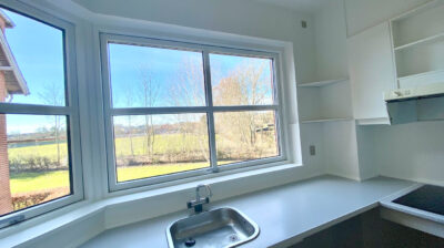 Badeværelset er rummeligt med fliser og bruseniche, hvilket giver en funktionel og moderne løsning. Soveværelset er velproportioneret med faste skabe, og den lyse stue har direkte adgang til en privat altan, hvor man kan nyde udsigten og solskin.