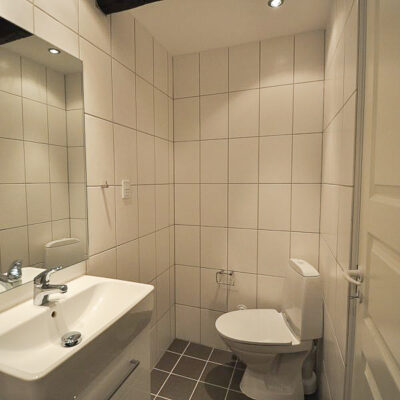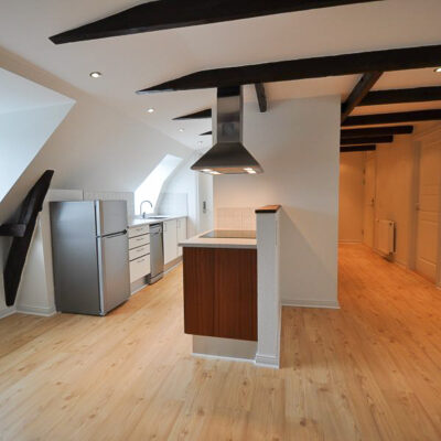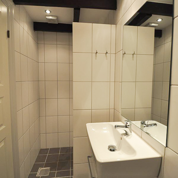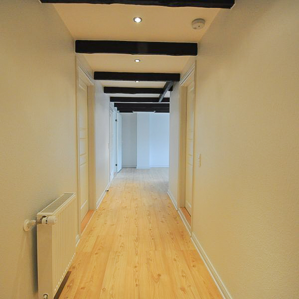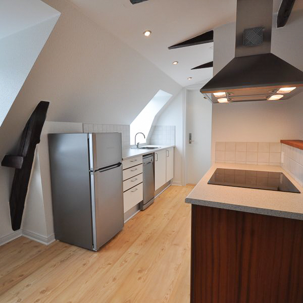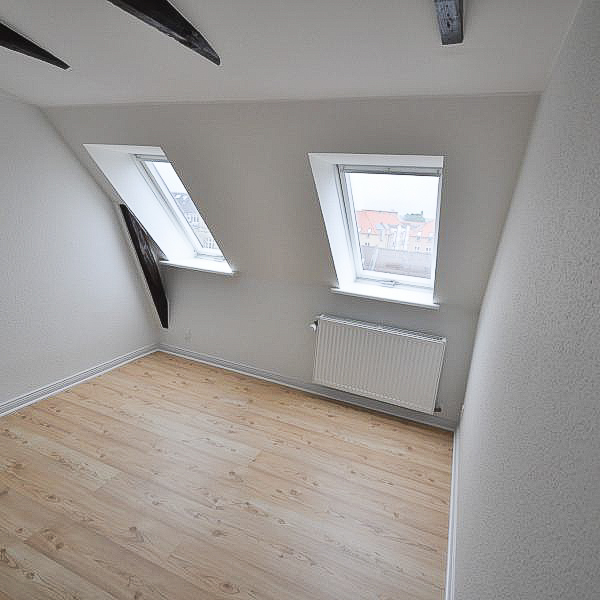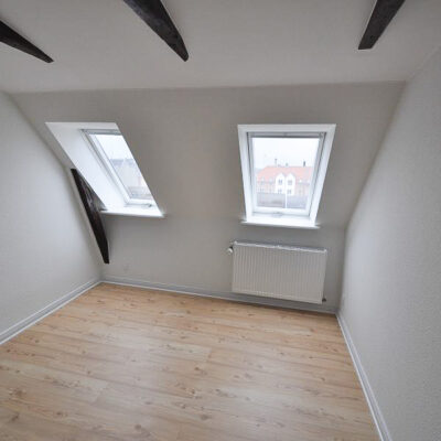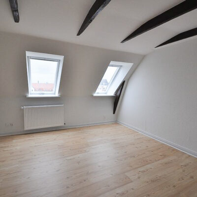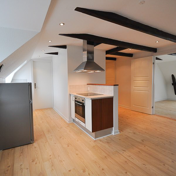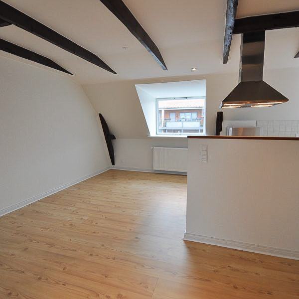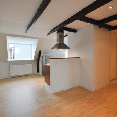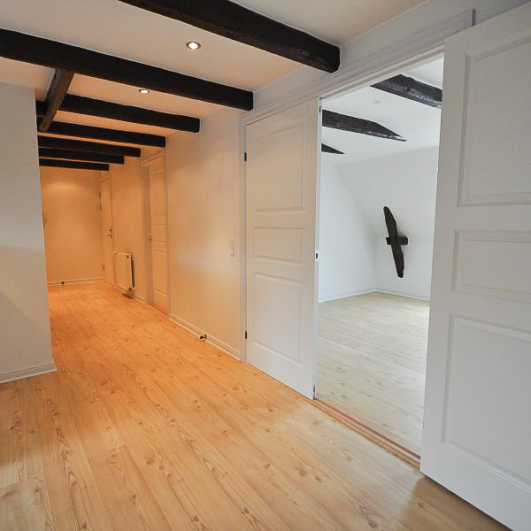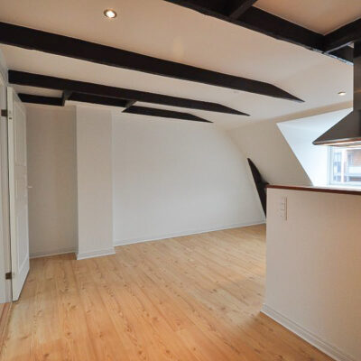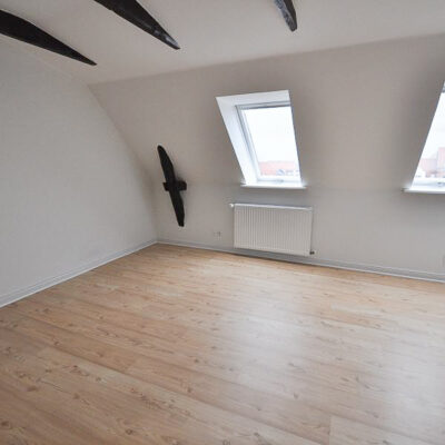 Fra alrummet åbner dobbeltdøre op til en stor, lys stue, som også nemt kan anvendes som ekstra værelse – alt efter behov. Soveværelset er rummeligt med plads til dobbeltseng, skabe og evt. skrivebord. Overalt i lejligheden finder du nye, flotte trægulve, fritlagte spær og spotbelysning, som skaber en varm og moderne atmosfære.
