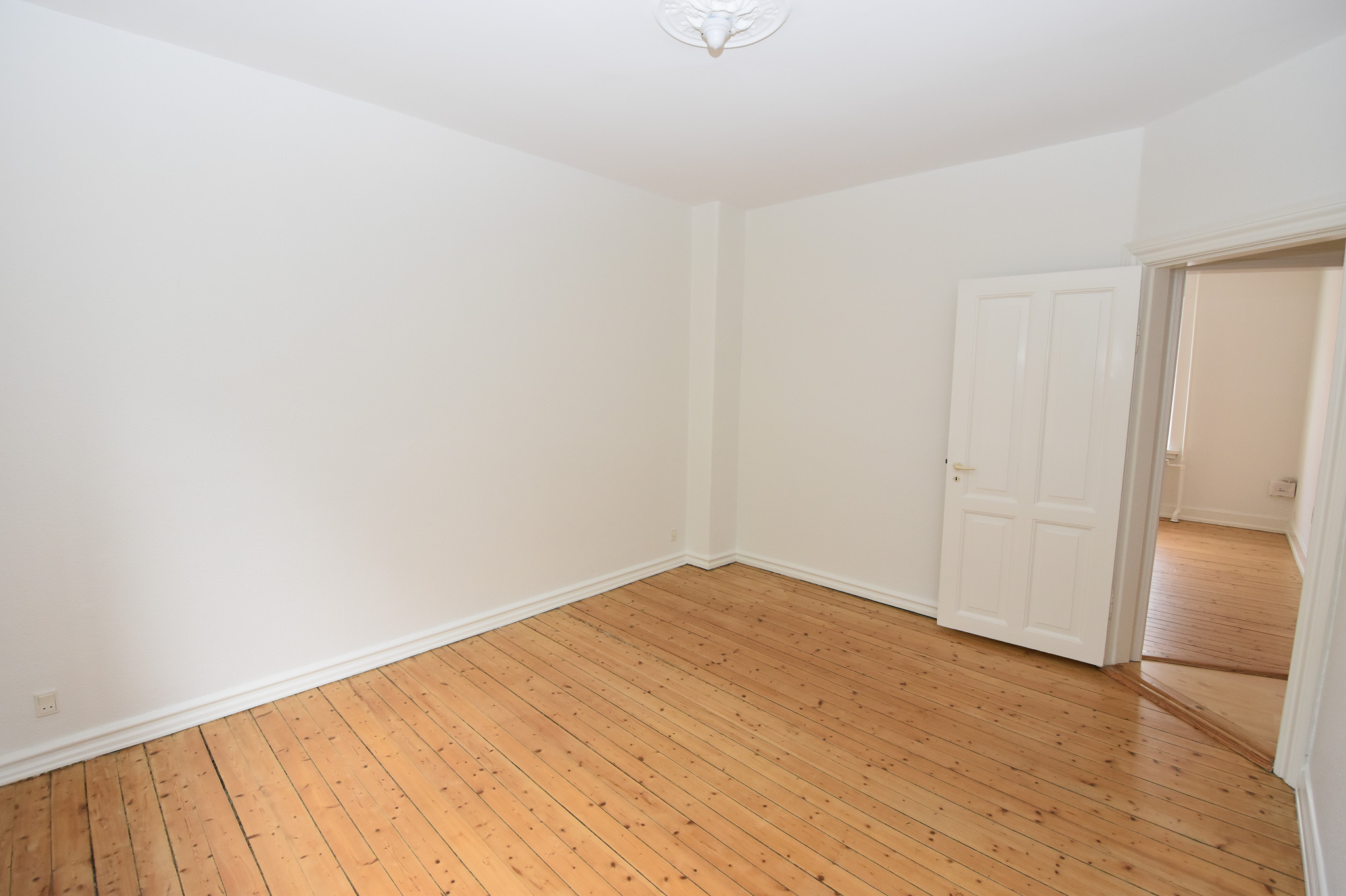 Lejligheden byder på en stor og lys entré, der åbner op til et moderne køkken indrettet med kvalitetsmaterialer. Her finder du hvide skabslåger med mahognikant og stålgreb, samt alle nødvendige hårde hvidevarer, herunder en rustfri opvaskemaskine og glaskeramisk komfur. Den rummelige stue prydes af et smukt stukloft, og det store soveværelse giver plads til både skrivebord og skabe. Badeværelset er elegant indrettet med moderne fliser, gulvvarme og en stor bruseniche, som skaber en indbydende oase.