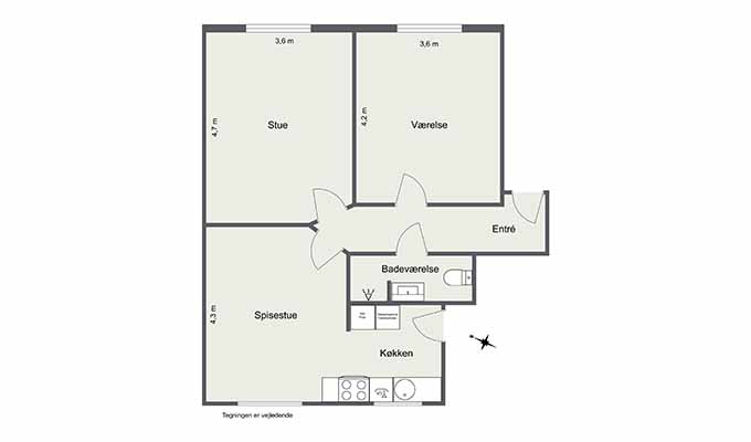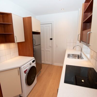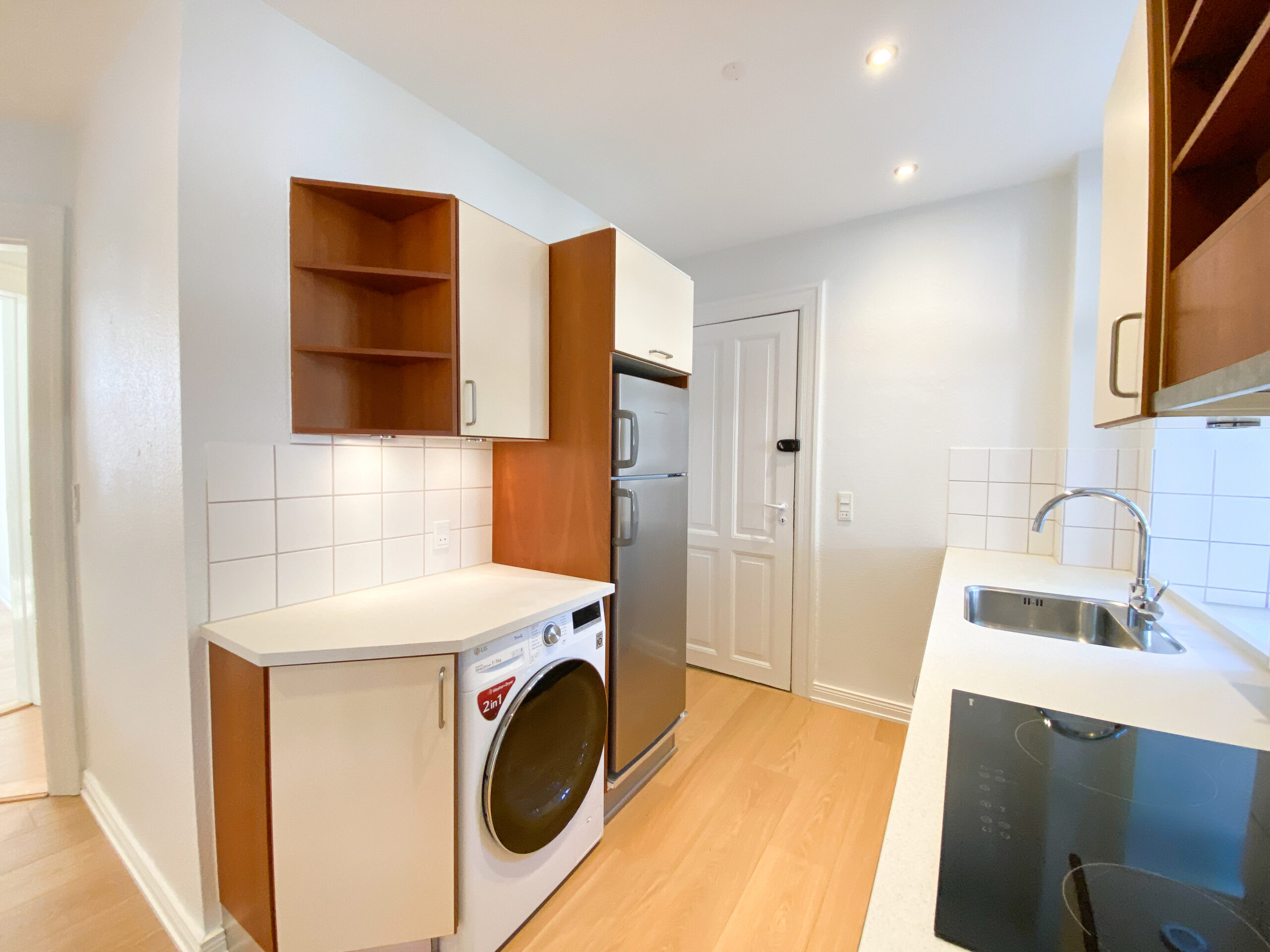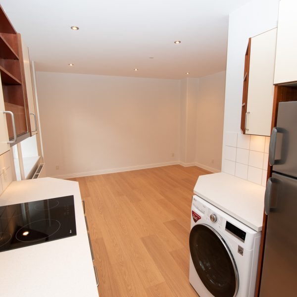 Lejligheden byder på en entré med adgang til alle rum, og et flot, lyst køkken med både opvaskemaskine samt kombineret vaskemaskine og tørretumbler. Køkkenet ligger i åben forbindelse med et alrum, som nemt kan indrettes som både spise- og opholdsstue.