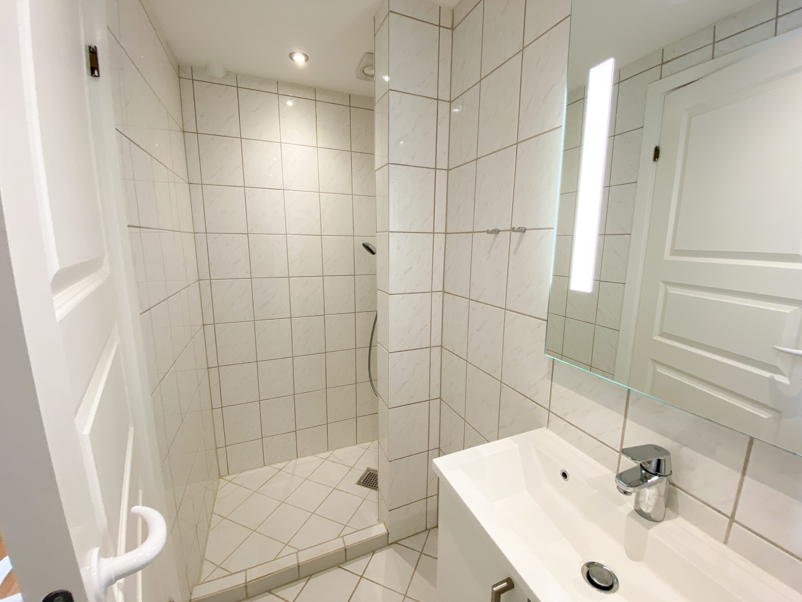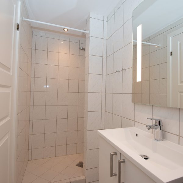 Badeværelset er lækkert og moderne med stor bruseniche og komfortabel gulvvarme.