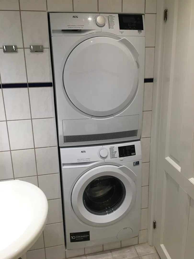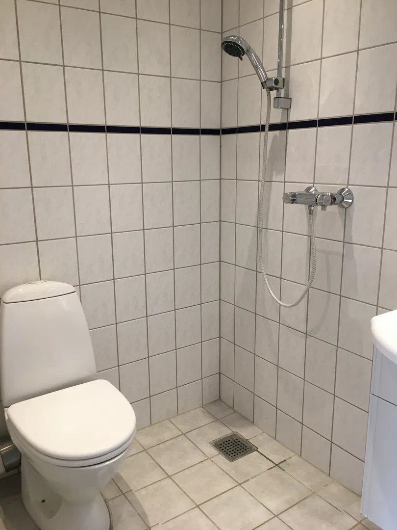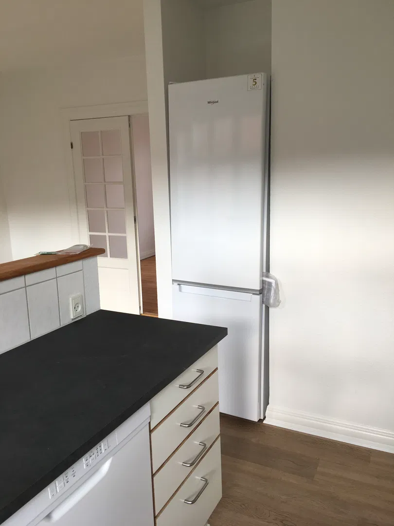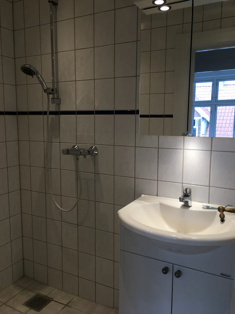 Køkkenet er lyst og funktionelt med hvide elementer og en sort bordplade, udstyret med komfur, emhætte, køle/fryseskab og opvaskemaskine. Badeværelset er praktisk indrettet med fliser, gulvvarme, bruseområde og en vaskesøjle med vaskemaskine og tørretumbler. Her er der tænkt på både komfort og funktionalitet.