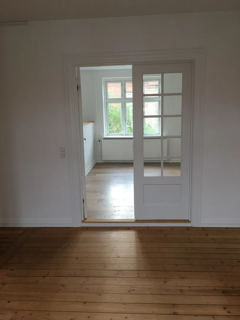 Lejligheden byder på en veldisponeret planløsning med to indretningsvenlige værelser og et dejligt opholdsafsnit, hvor stuen åbner sig til køkken-alrummet via lyse franske døre. De klassiske plankegulve, høje paneler og sprossede vinduer giver et charmerende lysindfald, der skaber en varm og indbydende stemning. Stuen er rummelig og giver plads til både sofa og TV, mens alrummet indbyder til hyggelige måltider og samvær.