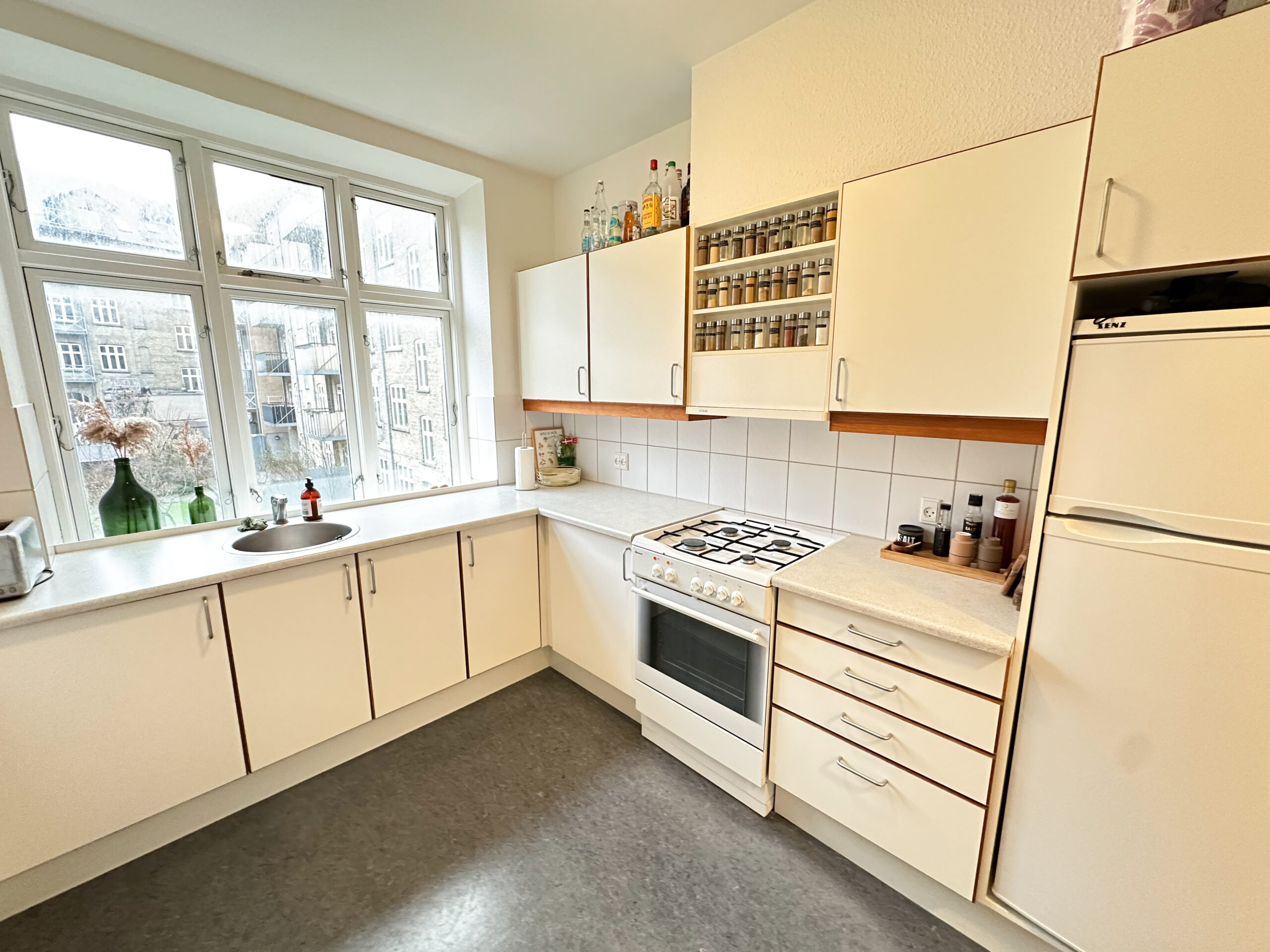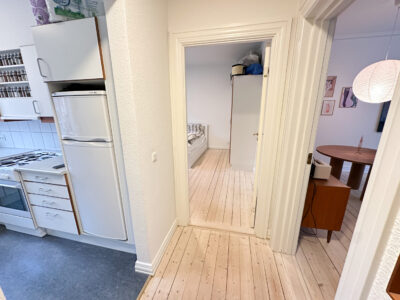 Lejligheden rummer smukke detaljer som originale plankegulve, stuklofter, karnap og højt til loftet, der sammen skaber en unik og indbydende atmosfære. Fra den praktiske fordelingsgang træder du ind i et stort, velholdt køkken, hvor der er god plads til både madlavning og sociale sammenkomster. Den rummelige stue er ideel til afslapning og samvær, mens det store soveværelse er udstyret med indbygget skab. Badeværelset er mindre, men særdeles funktionelt.