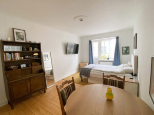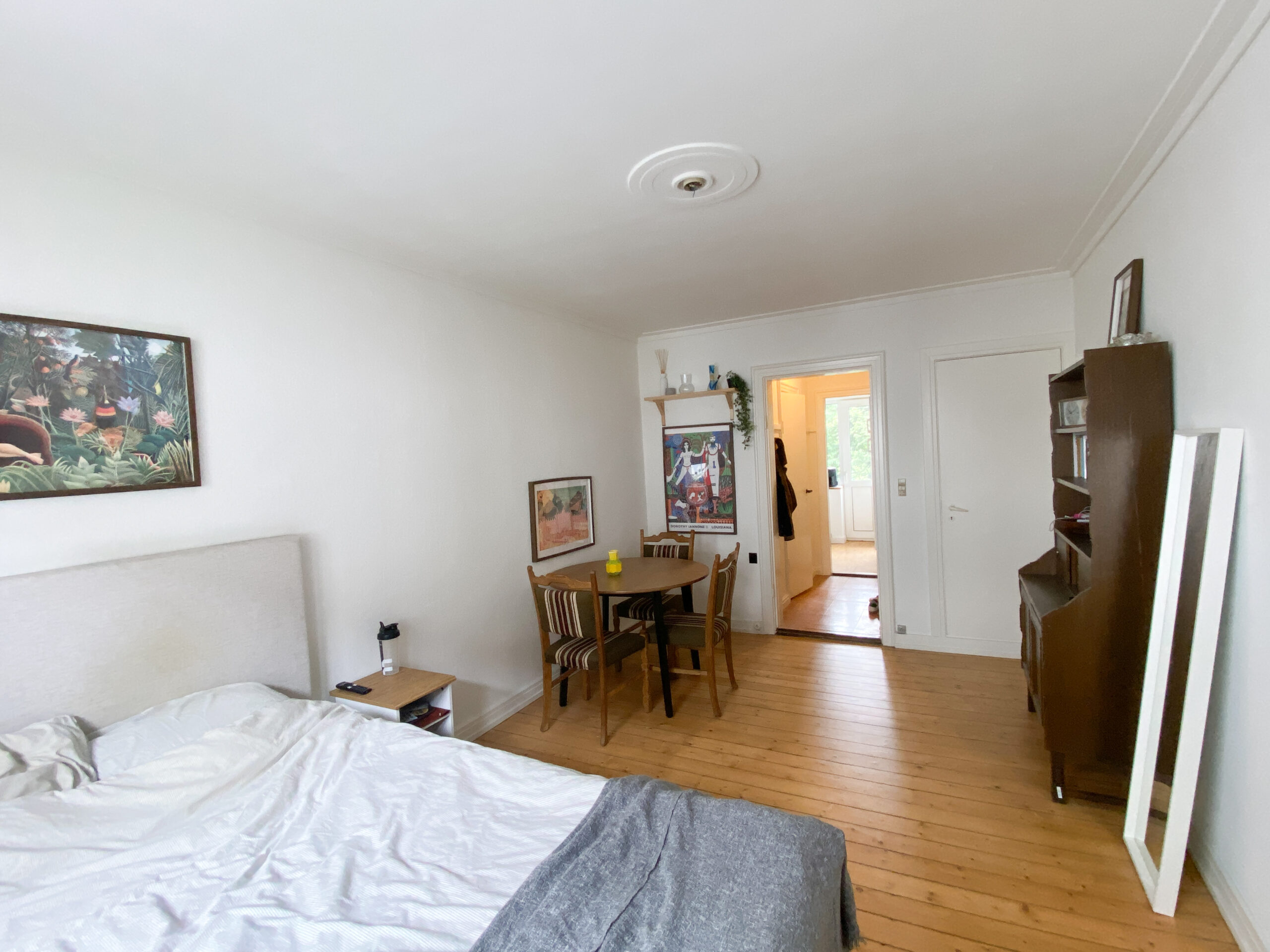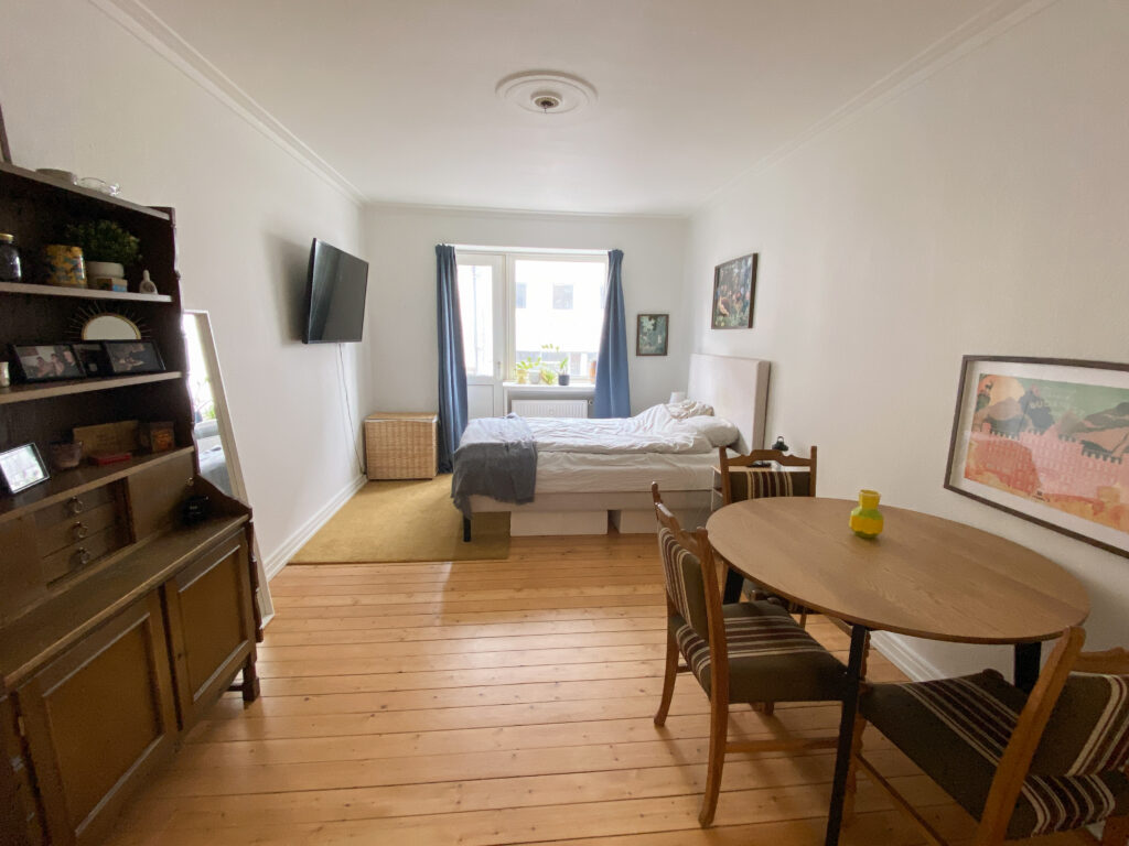 Til sidst har vi lejlighedens værelse, som er et godt rum med flotte gulve. Det er nemt at indrette, så man godt kan have lidt af hvert derinde. Herfra er der også en udgang til en lille altan.