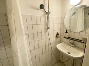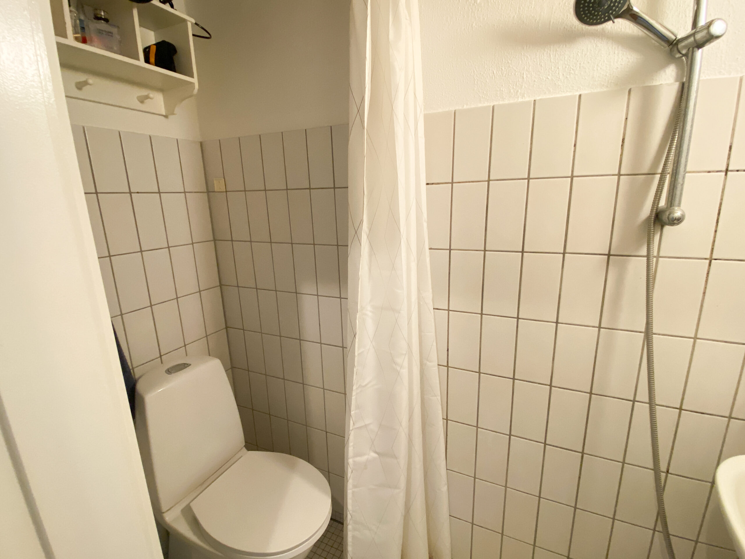 Lejligheden er bestående af en mindre entré, der først fører ud på badeværelse. Der er bruser i midten, og det holder det separeret.