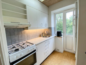 Så har vi køkkenet, som er super fint i hvide farver og har udgang til en lille altan.