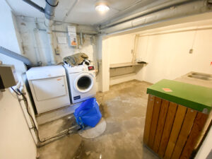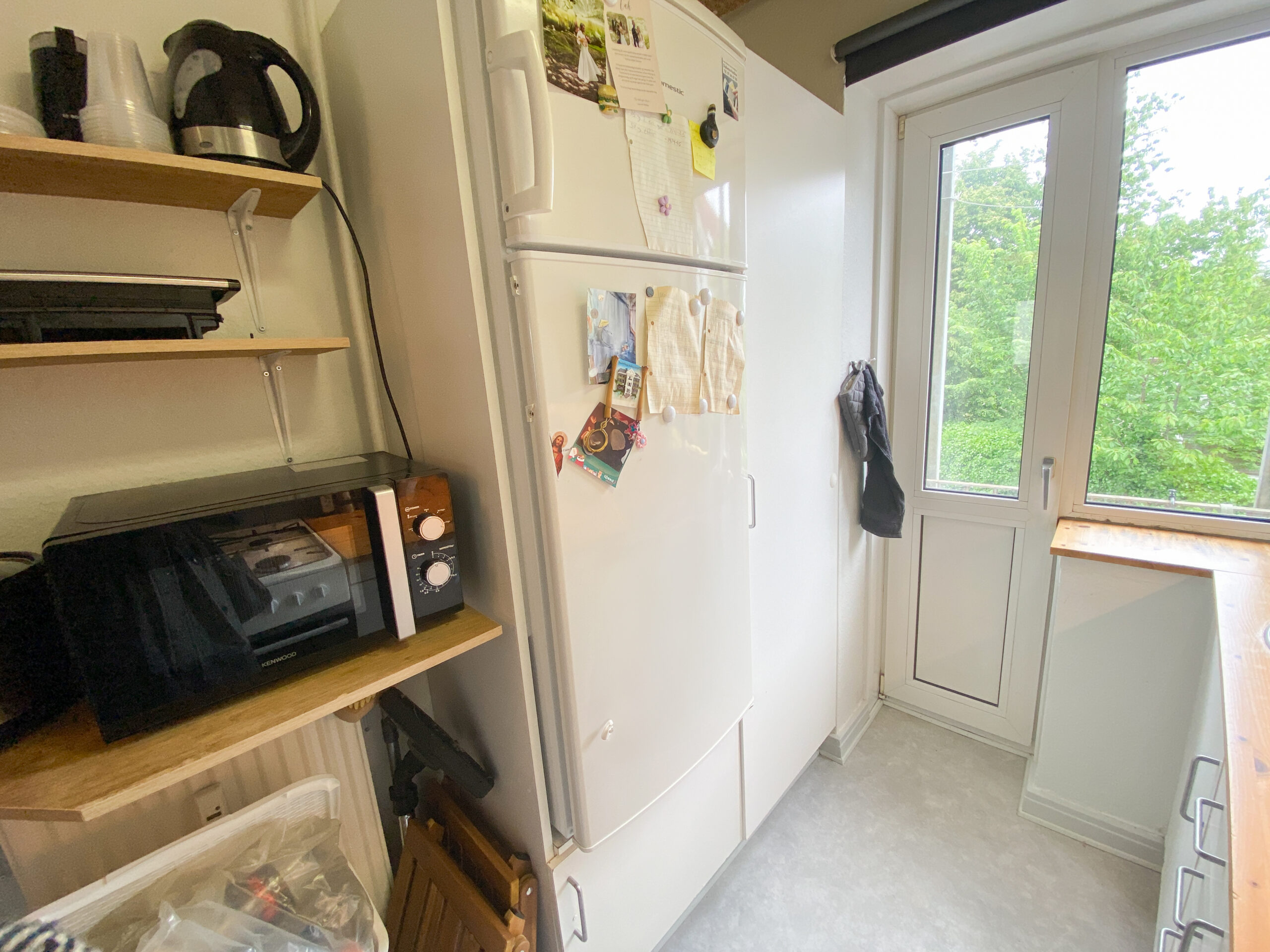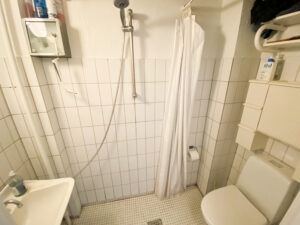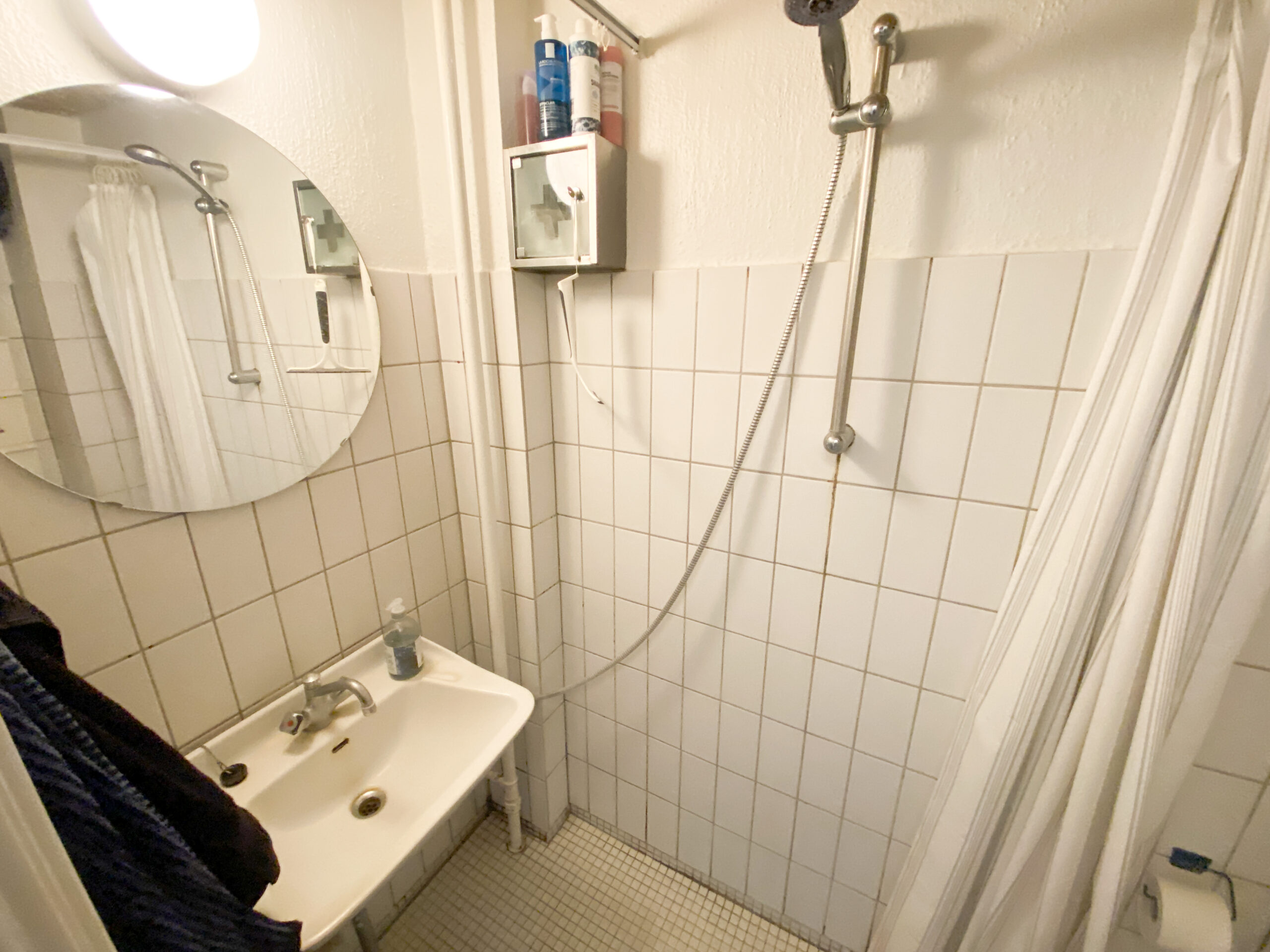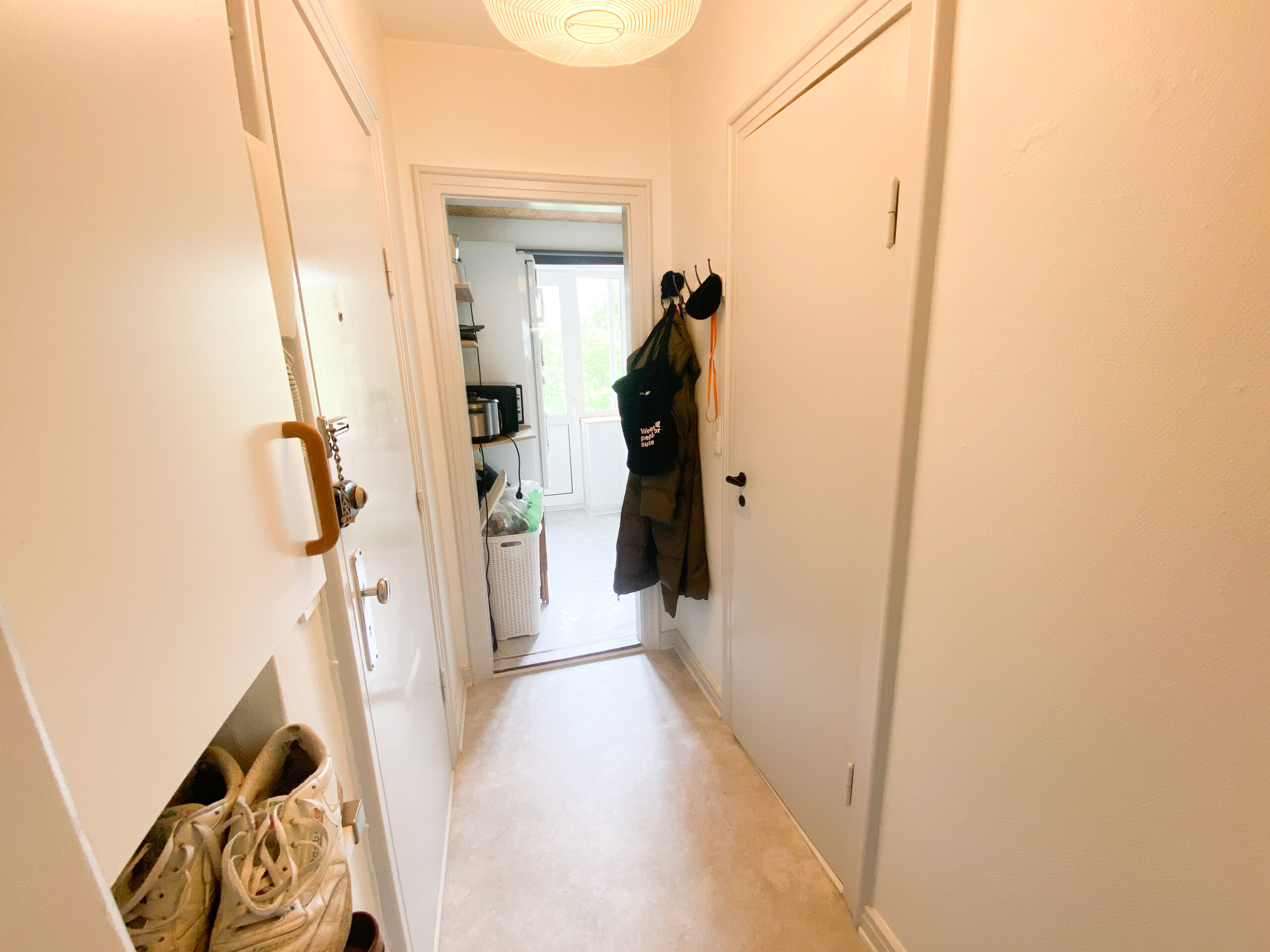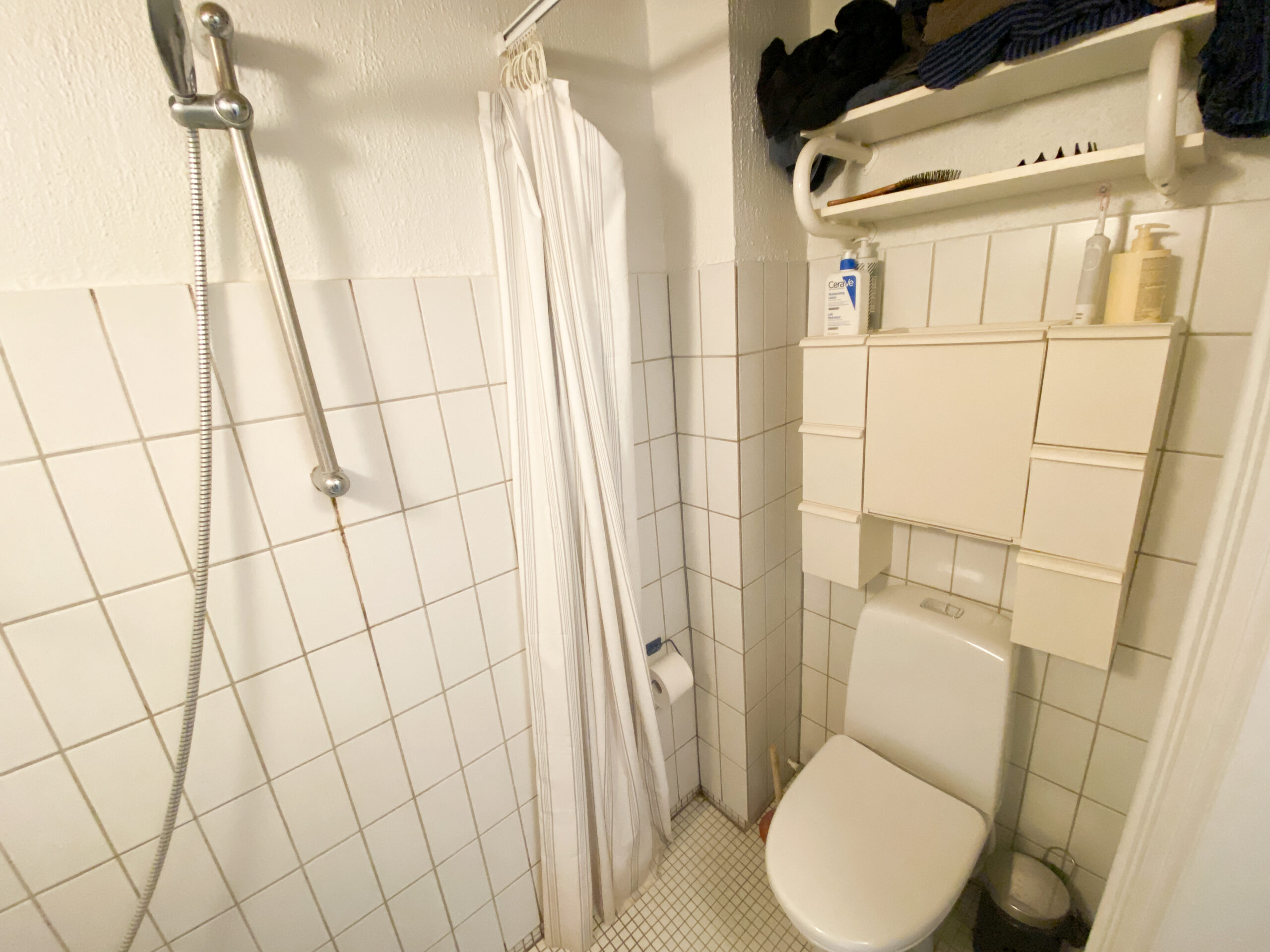 Lejligheden er bestående af en mindre entré, der først fører ud på badeværelse. Der er bruser i midten, og det holder det separeret.