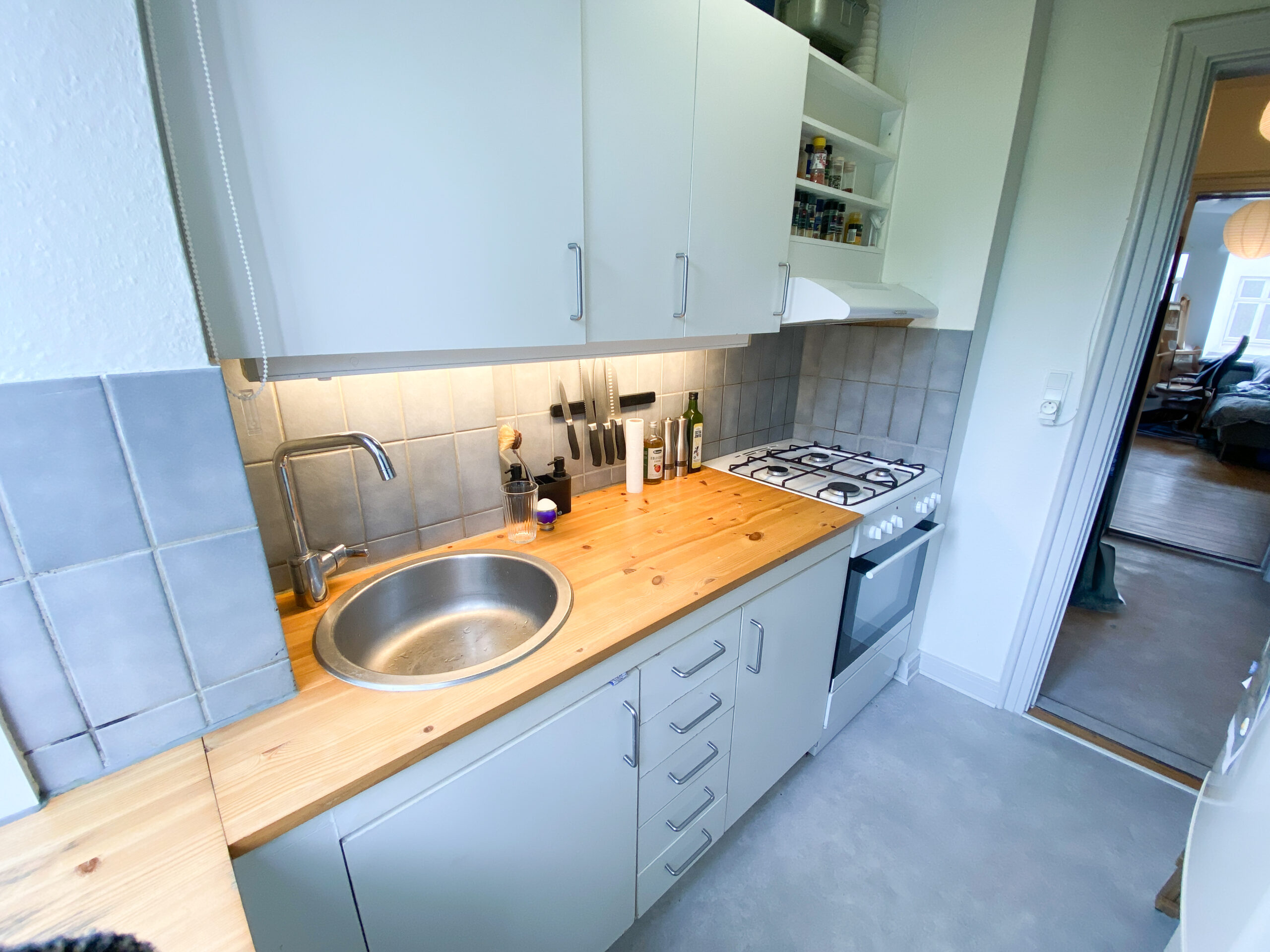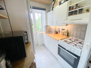 Så har vi køkkenet, som er super fint i hvide farver og har udgang til en lille altan.
