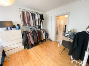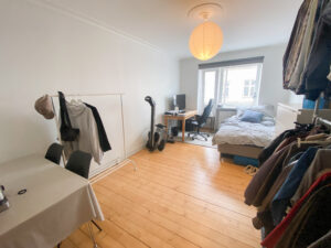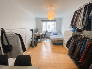 Til sidst har vi lejlighedens værelse, som er et godt rum med flotte gulve. Det er nemt at indrette, så man godt kan have lidt af hvert derinde. Herfra er der også en udgang til en lille altan.