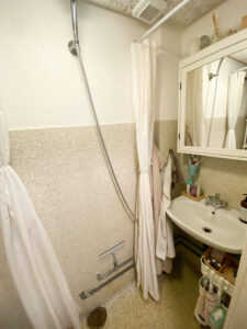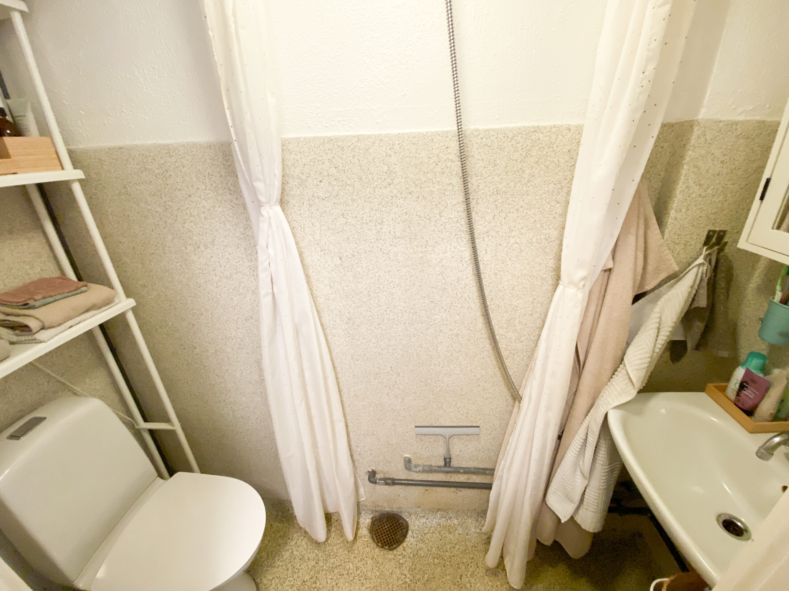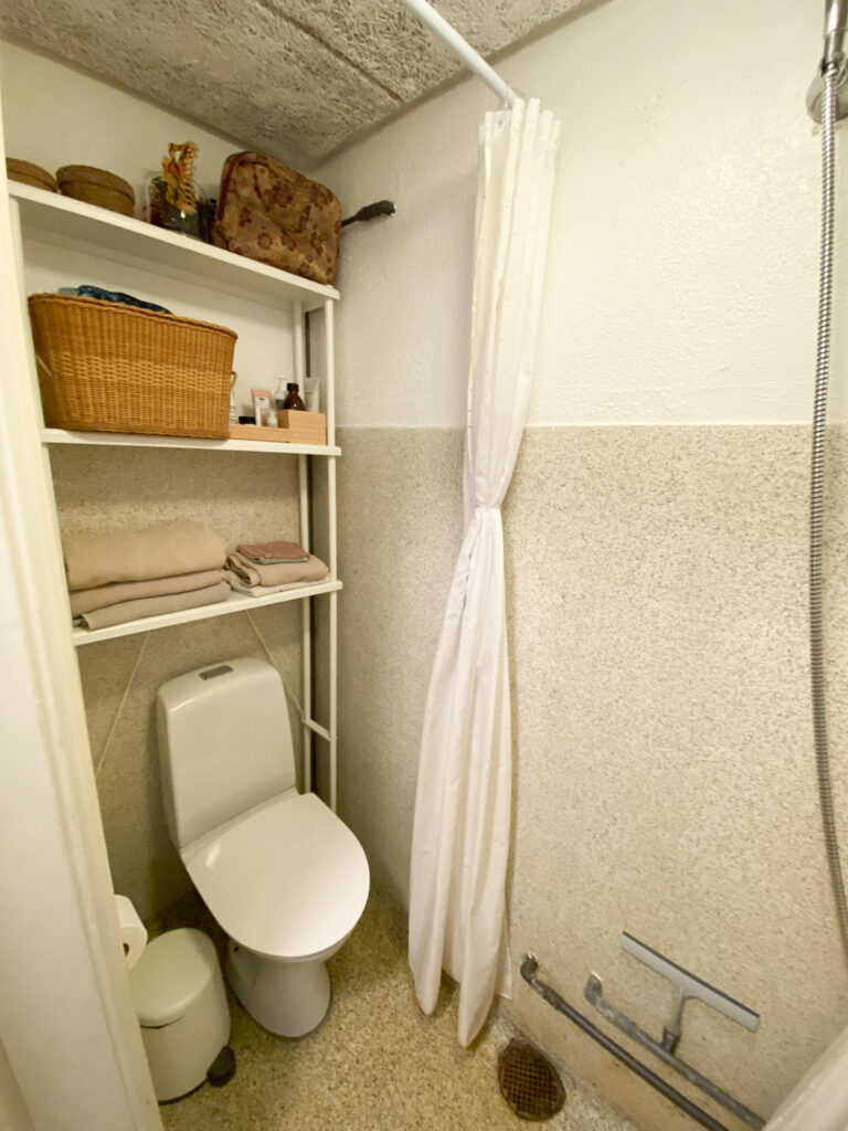 Lejligheden er bestående af en mindre entré, der først fører ud på badeværelse. Der er bruser i midten, og det holder det separeret.