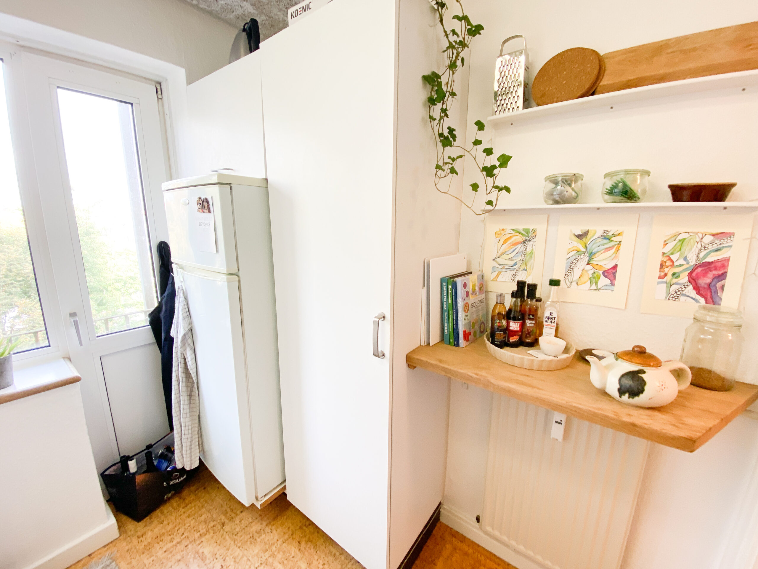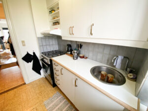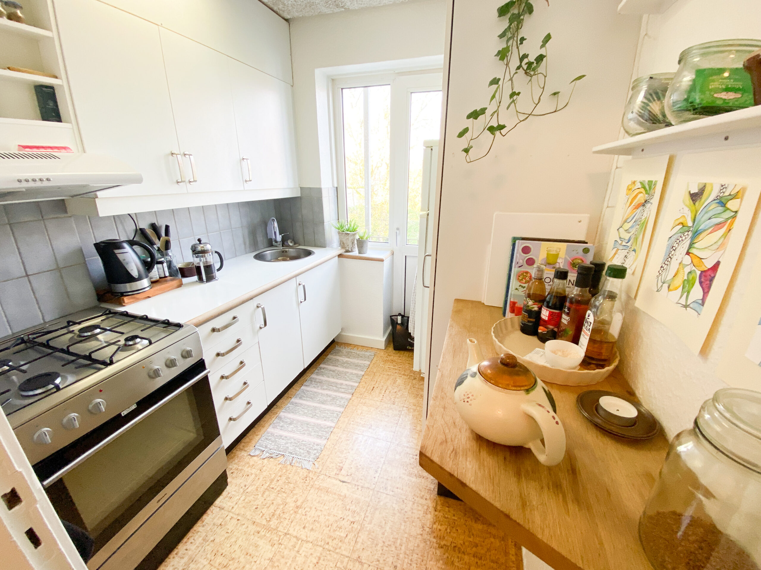Så har vi køkkenet, som er super fint i hvide farver og har udgang til en lille altan.