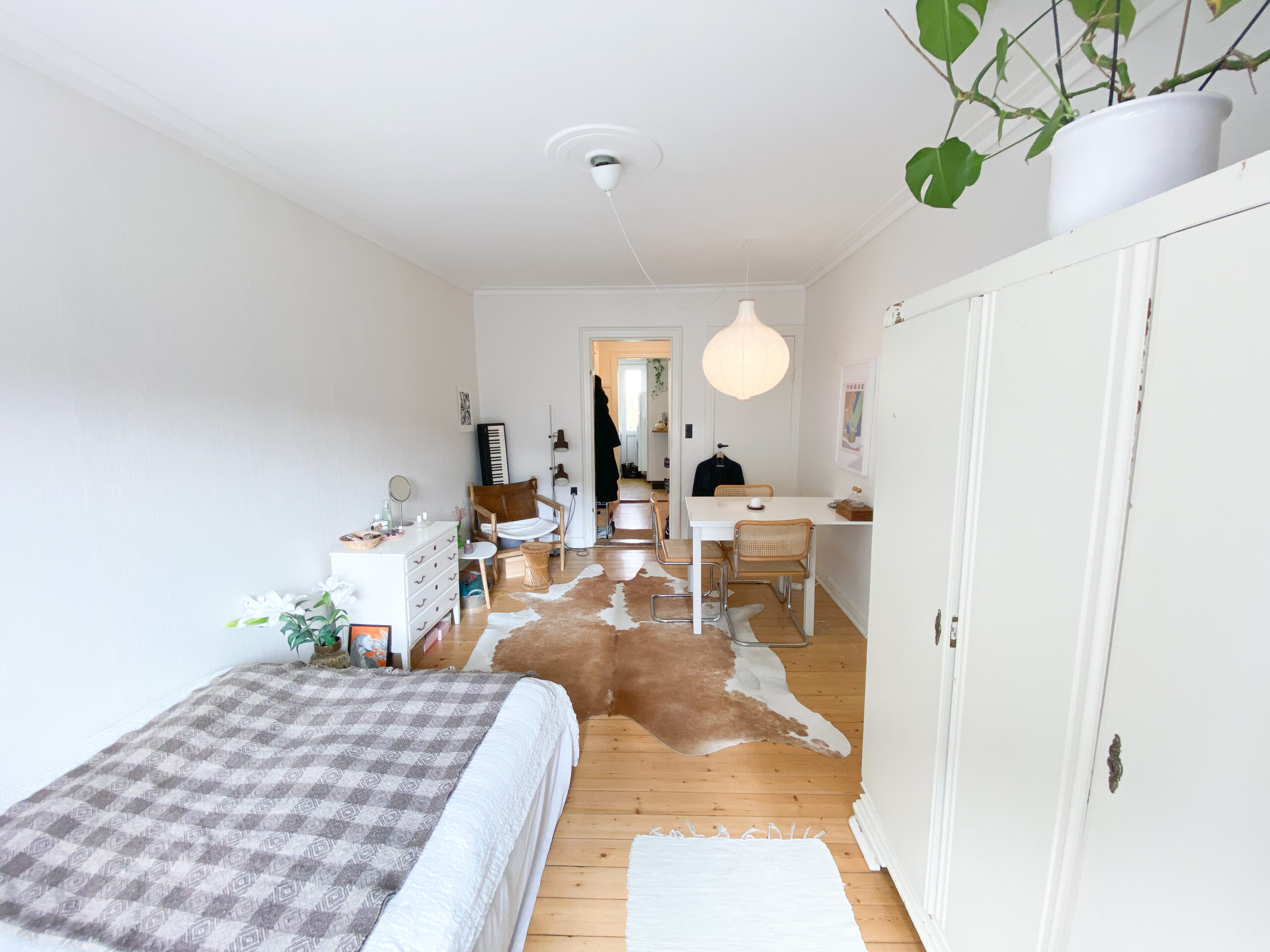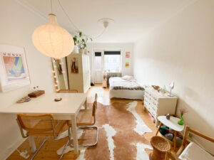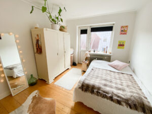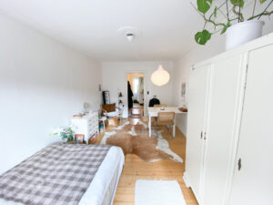 Til sidst har vi lejlighedens værelse, som er et godt rum med flotte gulve. Det er nemt at indrette, så man godt kan have lidt af hvert derinde. Herfra er der også en udgang til en lille altan.