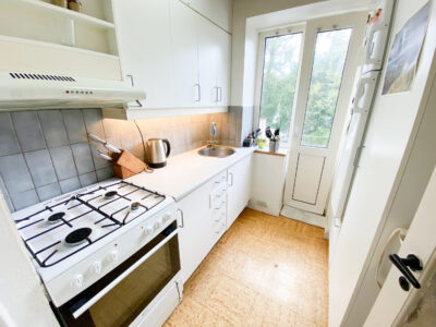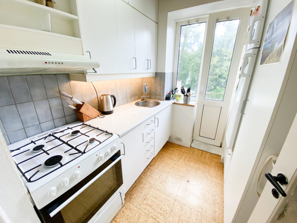 Så har vi køkkenet, som er super fint i hvide farver og har udgang til en lille altan.