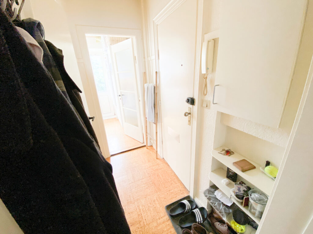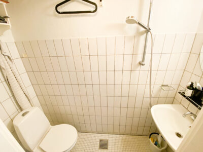 Lejligheden er bestående af en mindre entré, der først fører ud på badeværelse. Der er bruser i midten, og det holder det separeret.