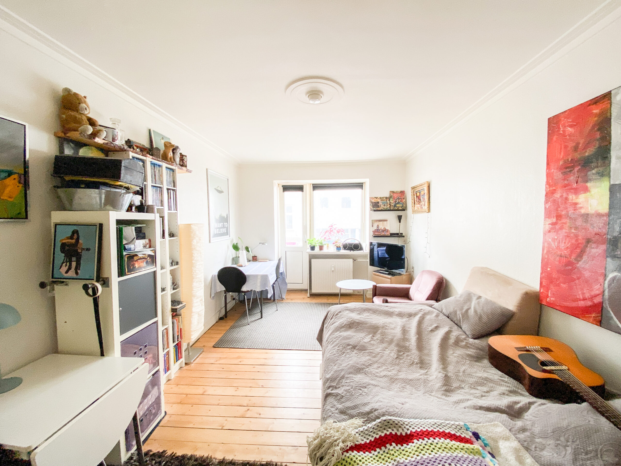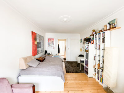 Til sidst har vi lejlighedens værelse, som er et godt rum med flotte gulve. Det er nemt at indrette, så man godt kan have lidt af hvert derinde. Herfra er der også en udgang til en lille altan.