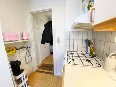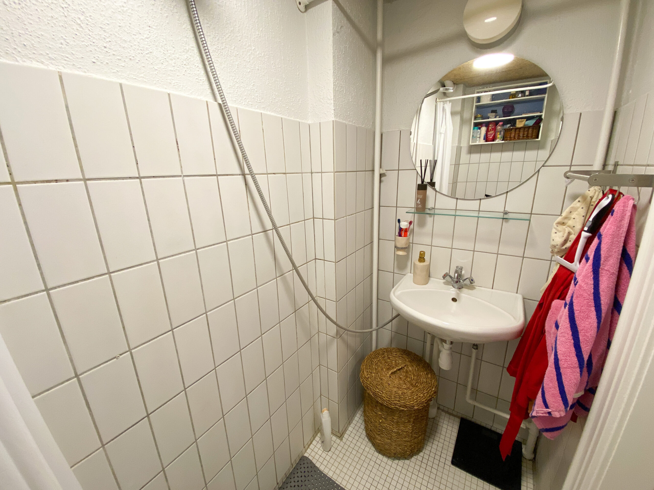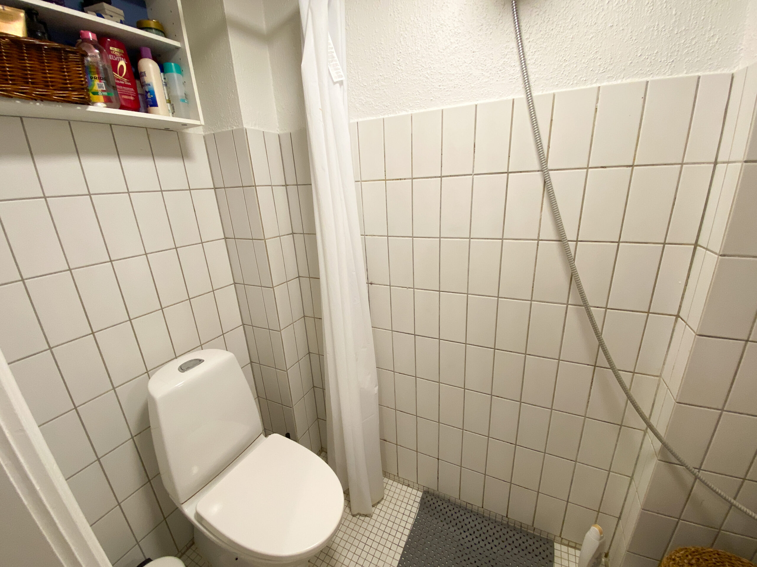 Lejligheden er bestående af en mindre entré, der først fører ud på badeværelse. Der er bruser i midten, og det holder det separeret.