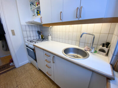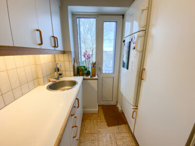 Så har vi køkkenet, som er super fint i hvide farver og har udgang til en lille altan.