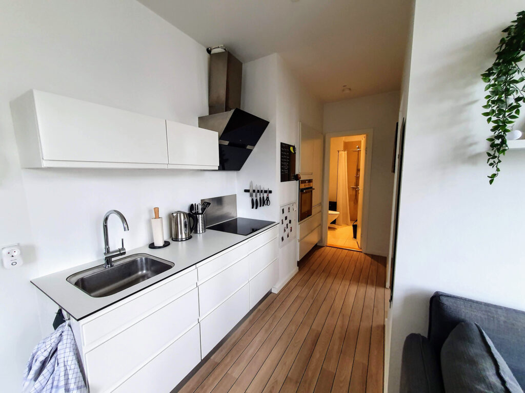 Lejligheden indeholder en hyggelig stue i forlængelse af køkkenet, som samtidig giver adgang til både soveværelse og badeværelse. De 34 kvm er rigtig godt udnyttet, hvilket gør at lejemålet virker større.
