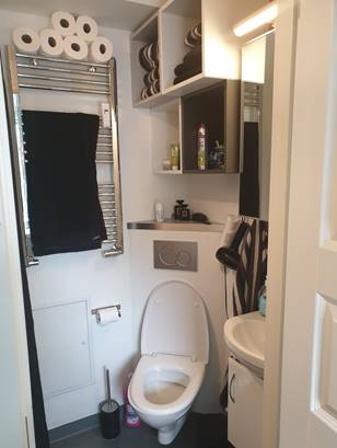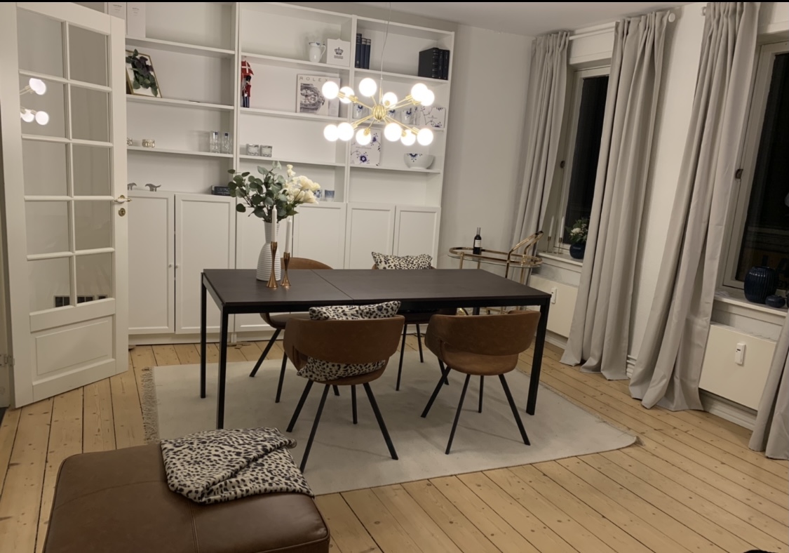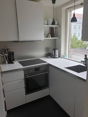 Lejligheden er udstyret med: Komfur, køleskab, fryser, opvaskemaskine og emhætte.