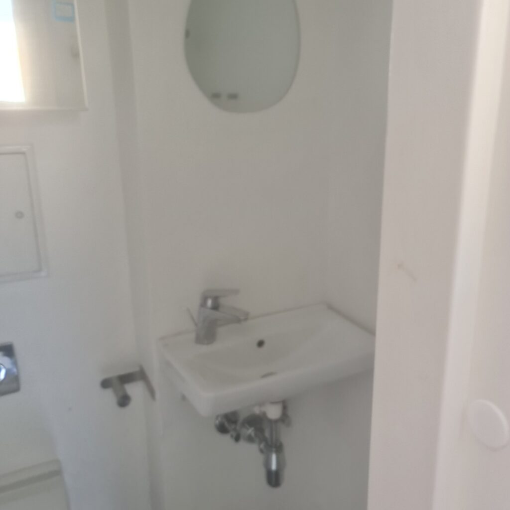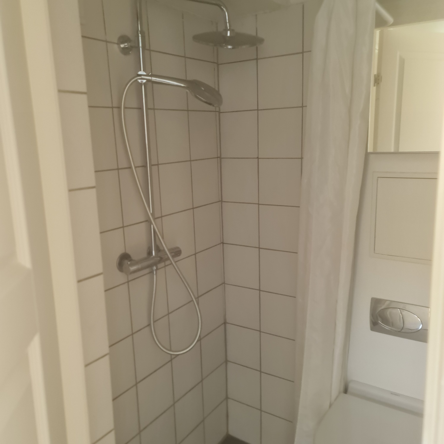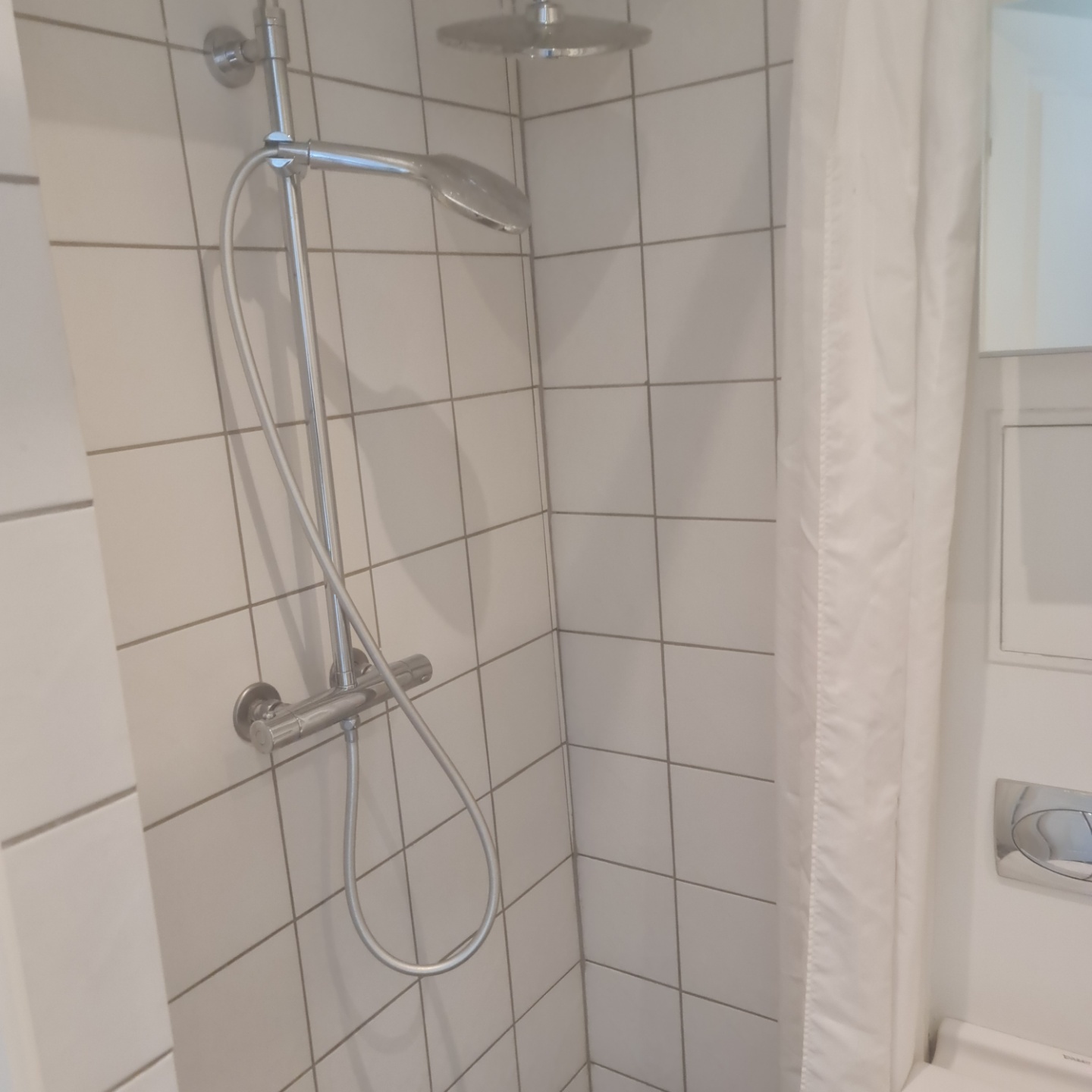 • Fint badeværelse med hvide klinker og væghængt toilet.