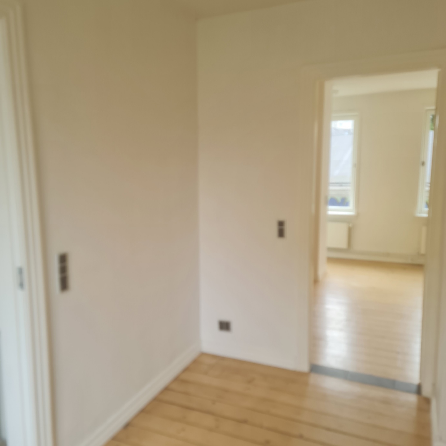 • Pænt nyere køkken i hvide elementer og med indbygget ovn og køle/fryse-skab.