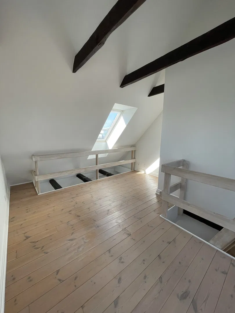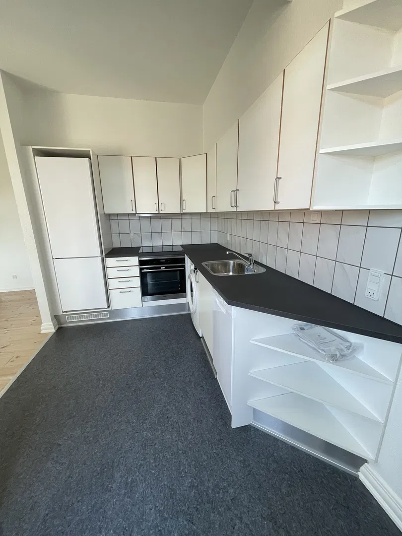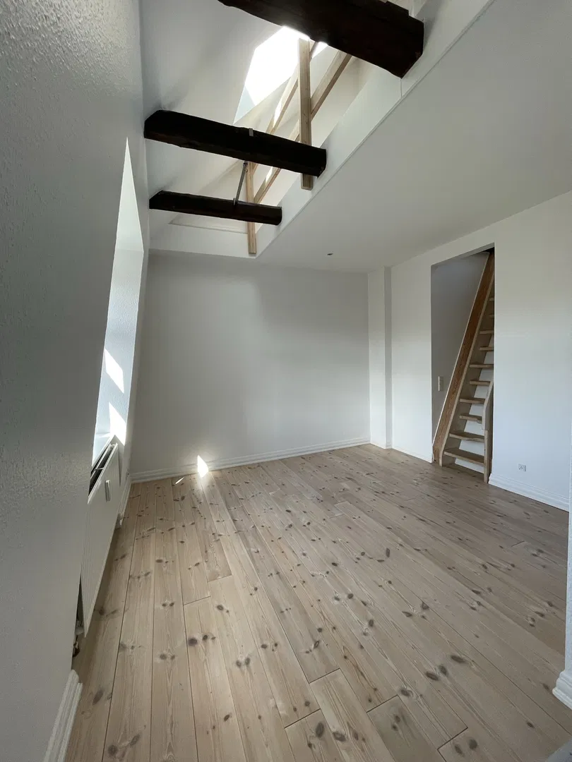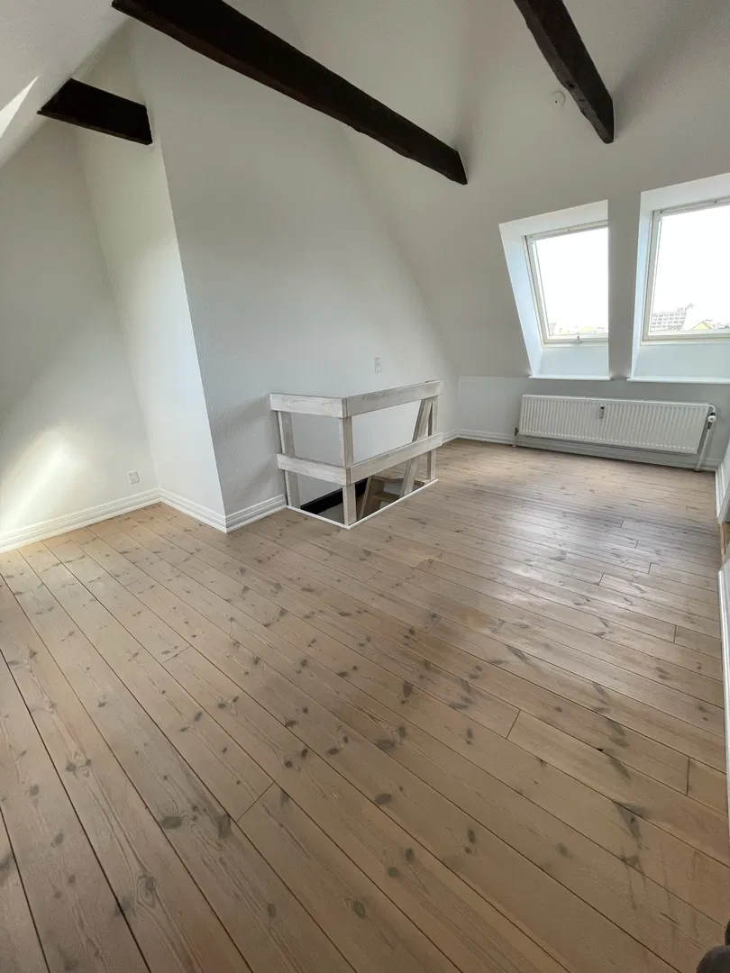 Lejligheden præsenterer sig med et lyst opholdsrum, hvor de flotte, afhøvlede og oliebehandlede plankegulve samt de synlige loftsbjælker skaber karakter og en luftig rumfornemmelse. Den rummelige stue er i åben forbindelse med et tidløst køkken, der byder på induktionskogeplade, indbygningsovn og en kombineret vaskemaskine/tørretumbler. Herfra kan du træde ud på den solrige, sydvendte altan med trædæk og stålgelænder – et perfekt sted at nyde morgenkaffen med udsigt over Aalborgs tage.