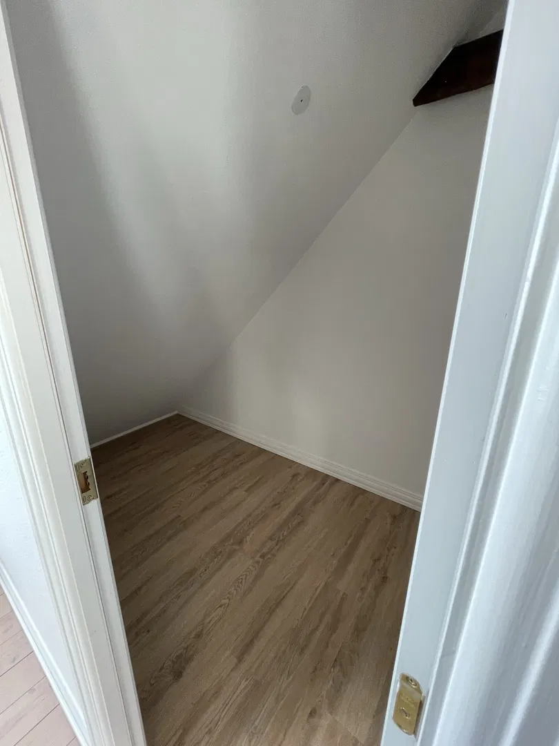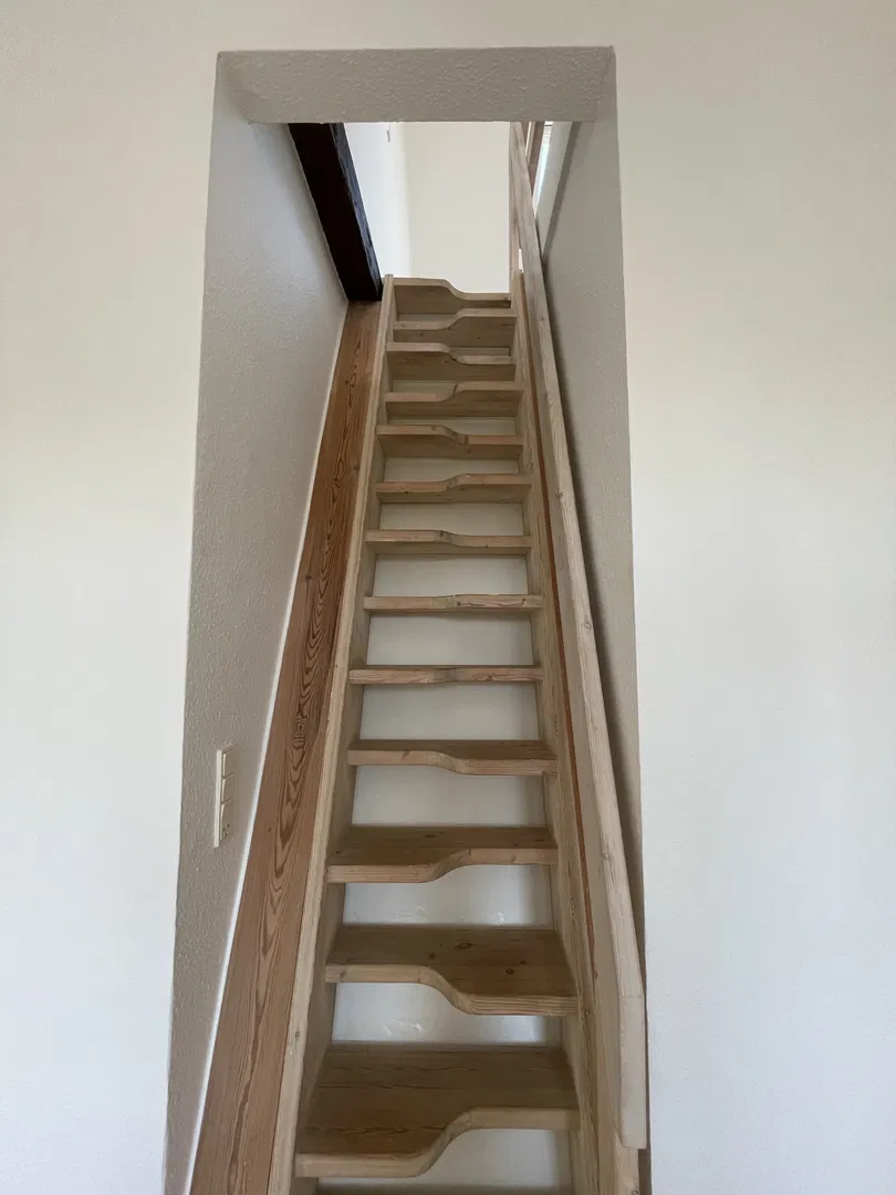 Soveværelset er indretningsvenligt og roligt med et smukt buet vindue, der trækker dagslyset ind. Badeværelset er praktisk indrettet med fliser, separat bruseniche og skabsarrangement, hvilket gør det nemt at holde. Fra stuen fører en fast trætrappe op til en møblerbar hems med ovenlys, ideel til hjemmekontor eller gæsteafsnit, samt et ekstra rum til opbevaring.