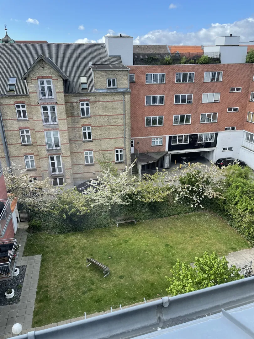 Fra altanen og de store vinduespartier kan du nyde et skønt bykig over kvarterets klassiske tage og gårdrum.