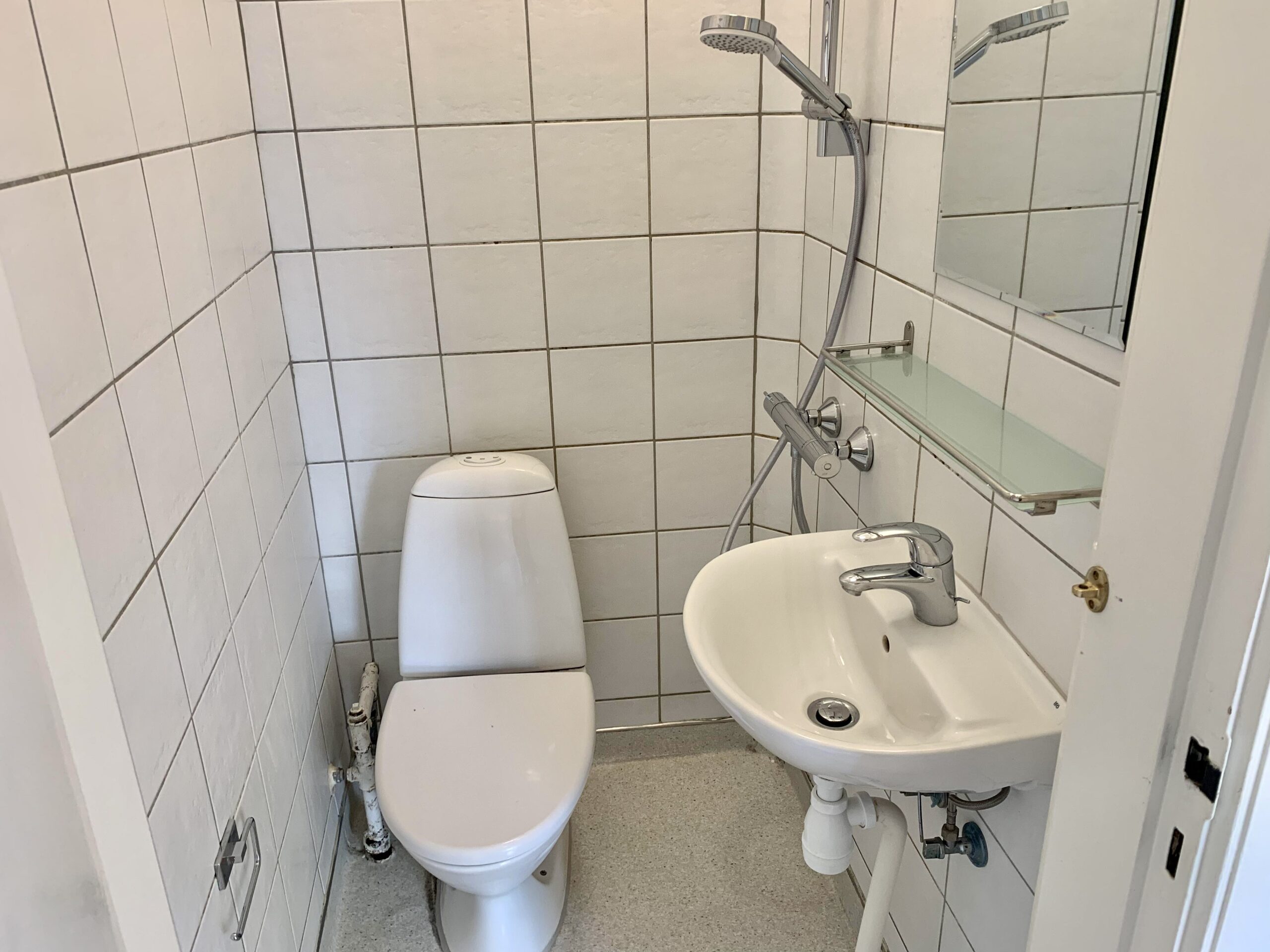 Badeværelset er kompakt, men velholdt med hvide klinker, der giver en ren og frisk følelse. Badet ved siden af toilettet gør det nemt og bekvemt at ordne dine morgenrutiner.