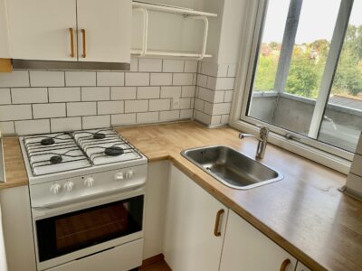 Køkkenet er udstyret med et køleskab/frys og en gaskomfur, der giver dig alt, hvad du behøver til madlavning og opbevaring. Selvom det kan være ældre af udseende, er det stadig i god stand og funktionelt.
