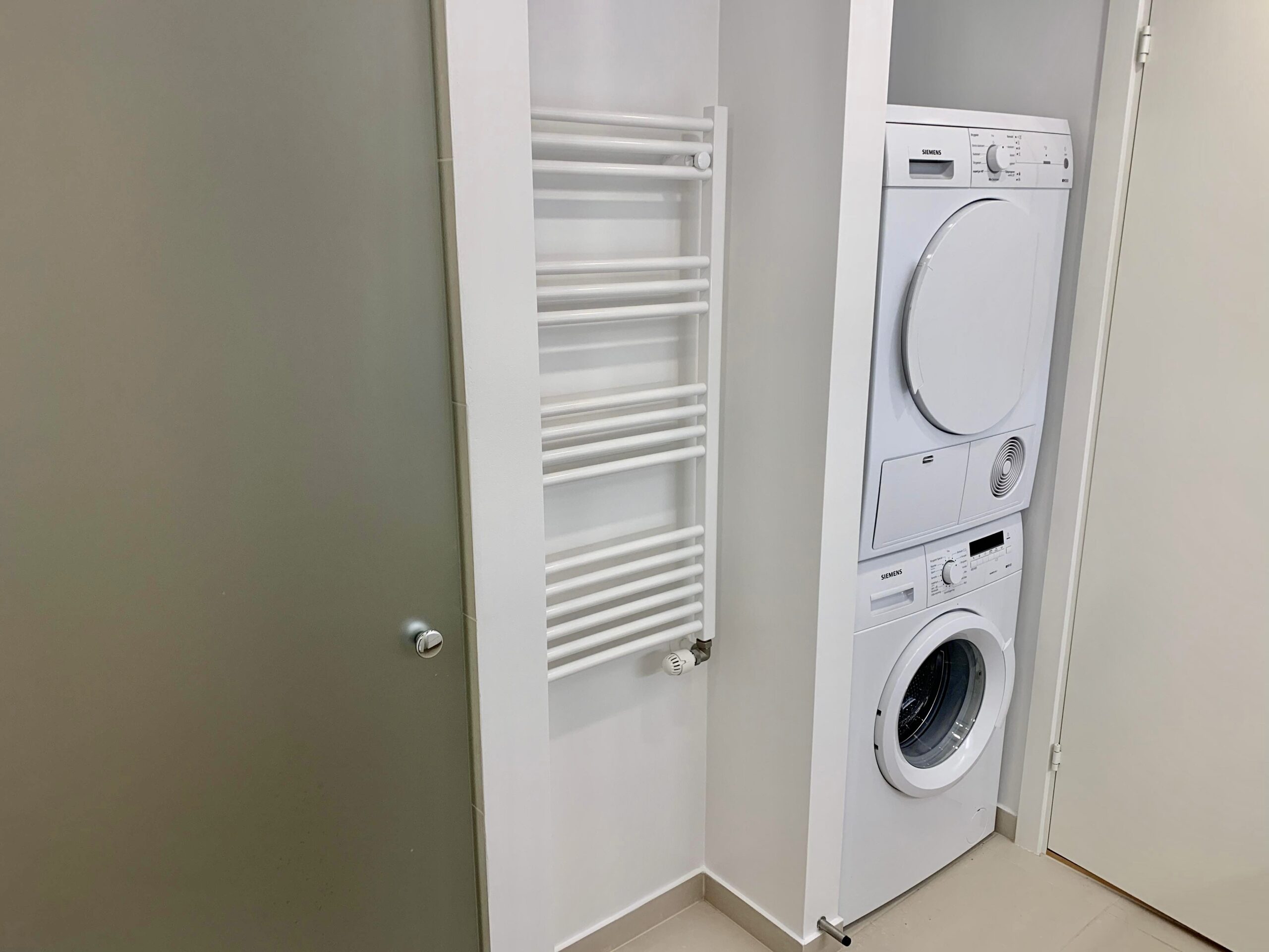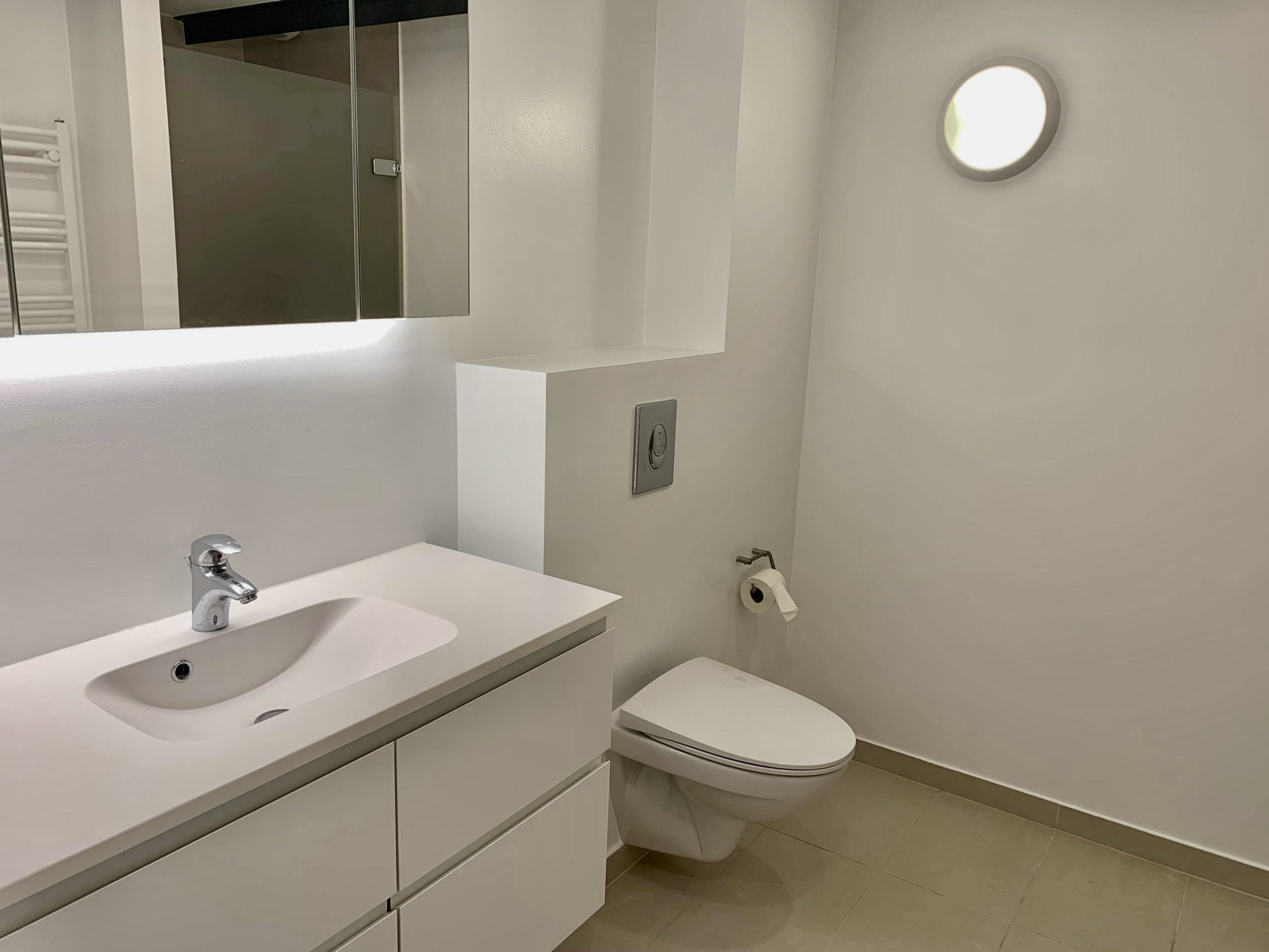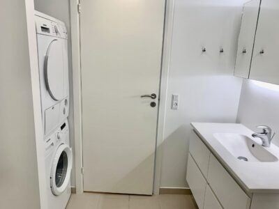 Lyst badeværelse med klinker på gulv, fliser på vægge i bruseniche, glasdør ved bruseniche, væghængt toilet, vaske arrangement med skabe, gulvvarme, kombineret vaskemaskine/tørretumbler samt spots i loft.