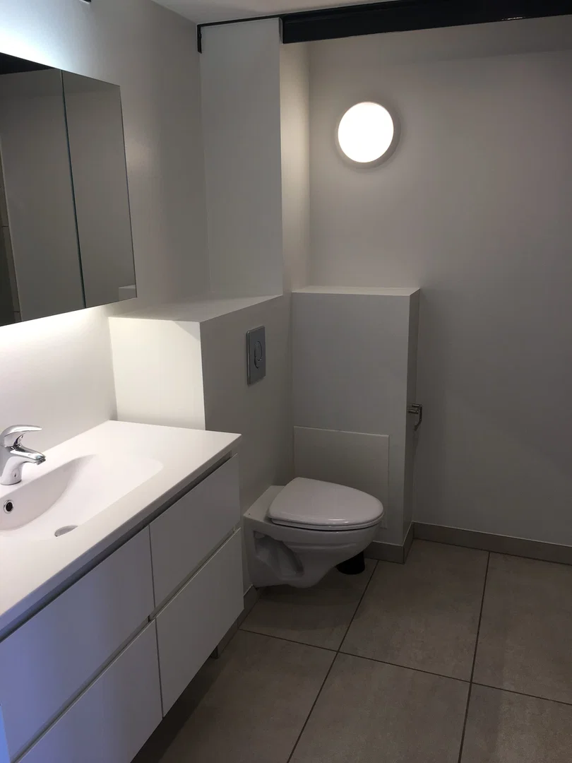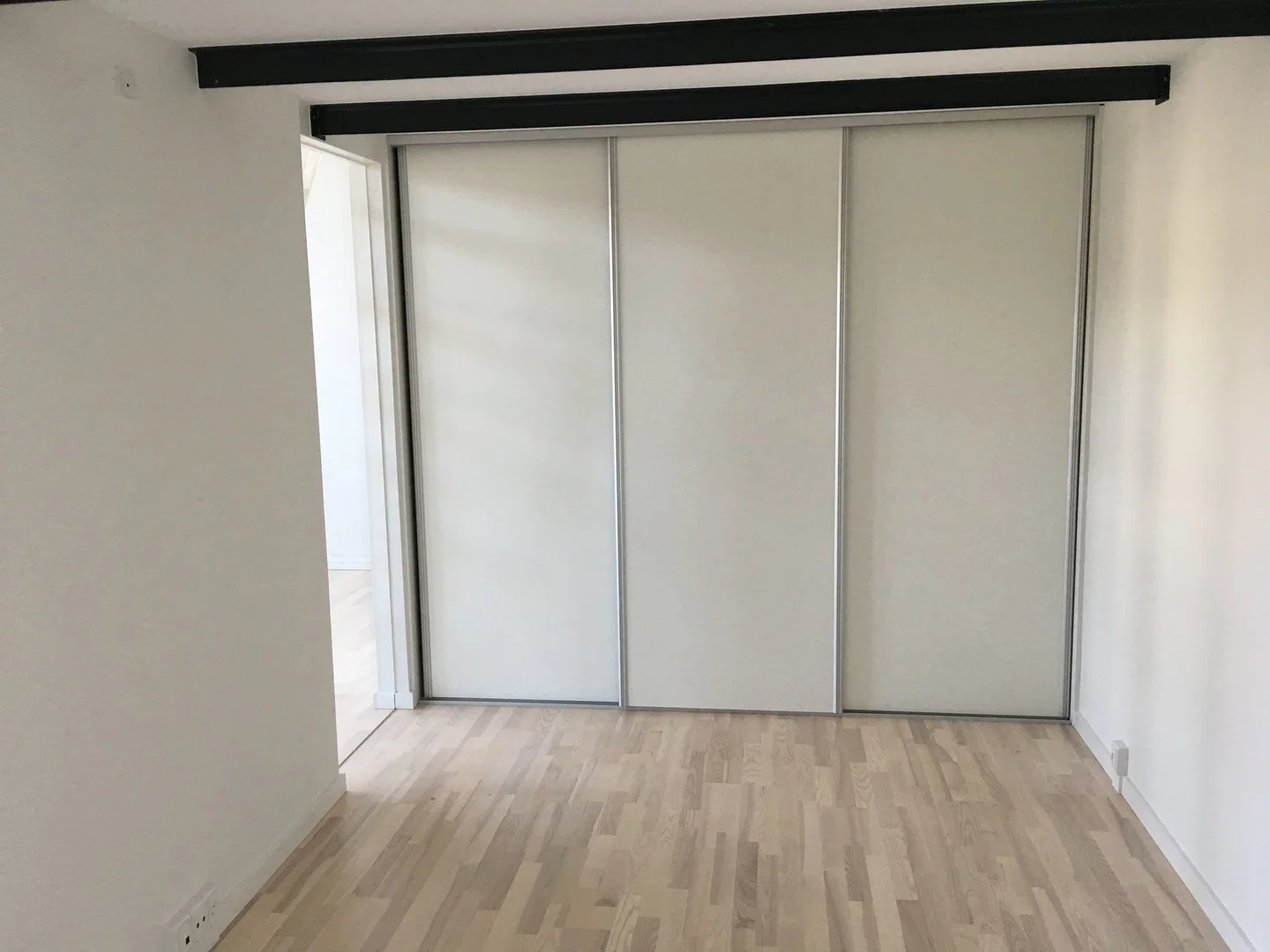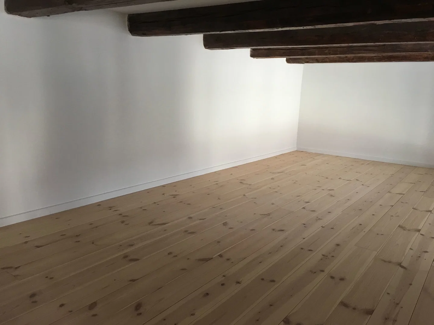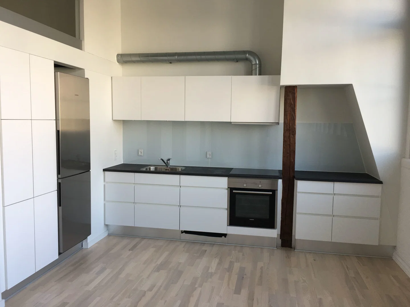 Lejligheden byder på et lyst og åbent køkken/alrum med synlige bjælker, der giver karakter og en indbydende rumfornemmelse. Her er god plads til både spisebord og sofaarrangement, og den store loftshøjde skaber en særligt indbydende stemning. Det stilrene hvide køkken er grebsfrit og veludstyret med indbygningsovn, keramisk kogeplade, emhætte samt integreret opvaskemaskine. Den åbne forbindelse til soveværelset, der har et stort garderobeskab, sikrer et godt lysindfald.