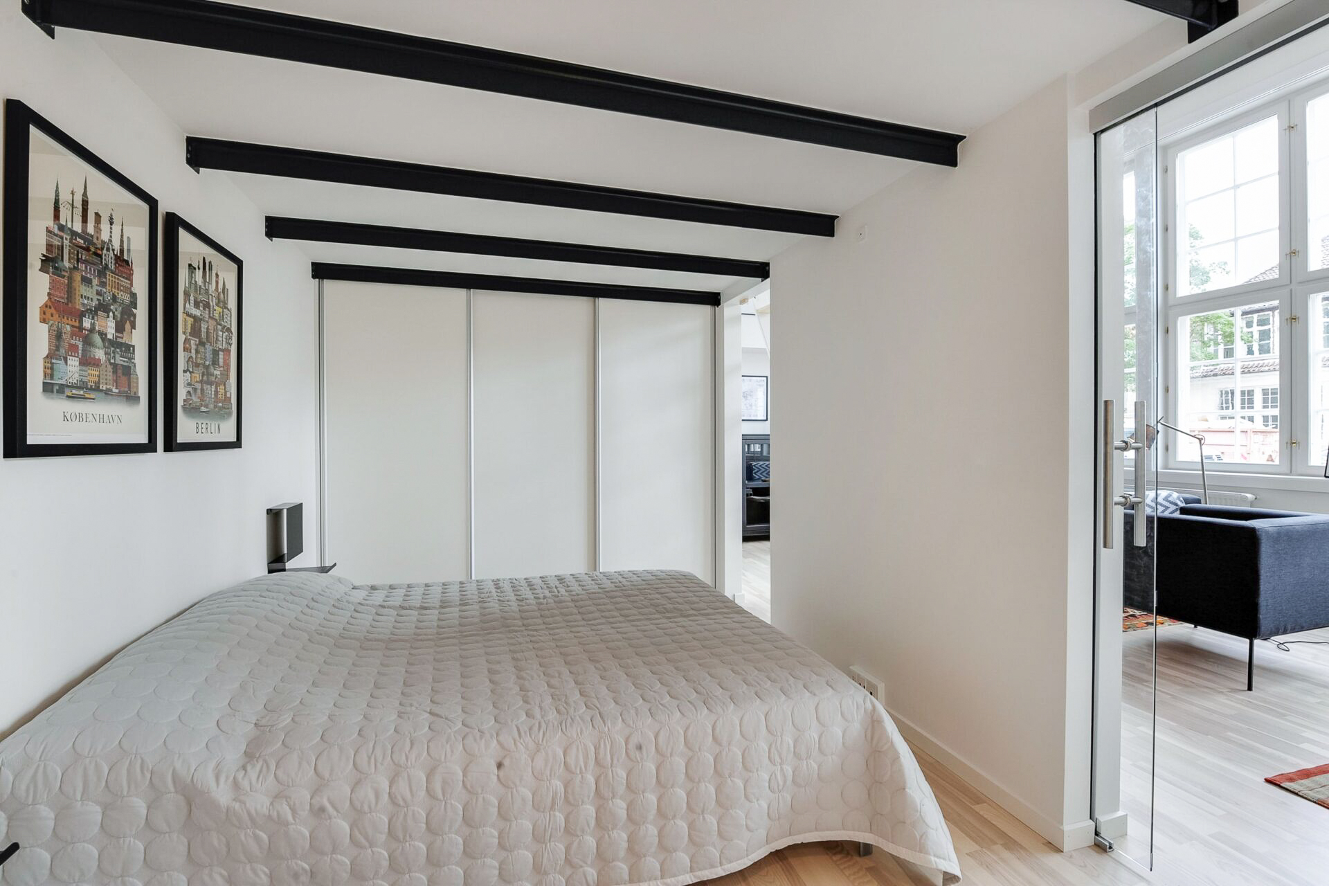 Soveværelse med glasdør/vindue ind til stuen, stort garderobeskab med skydelåger.