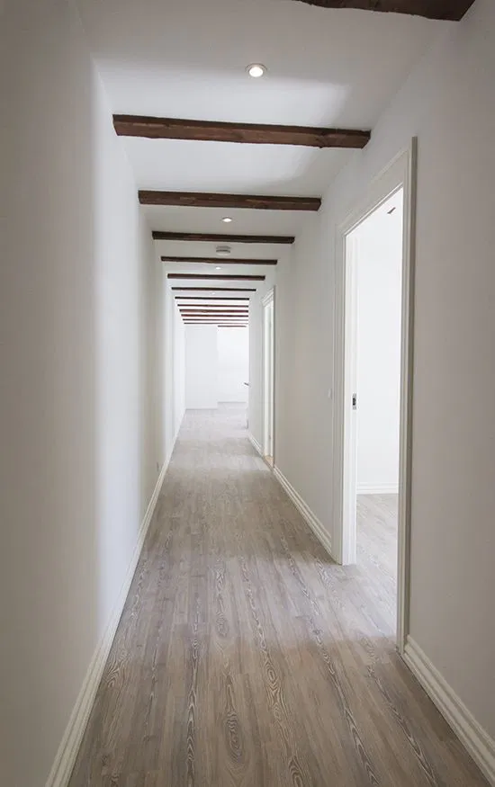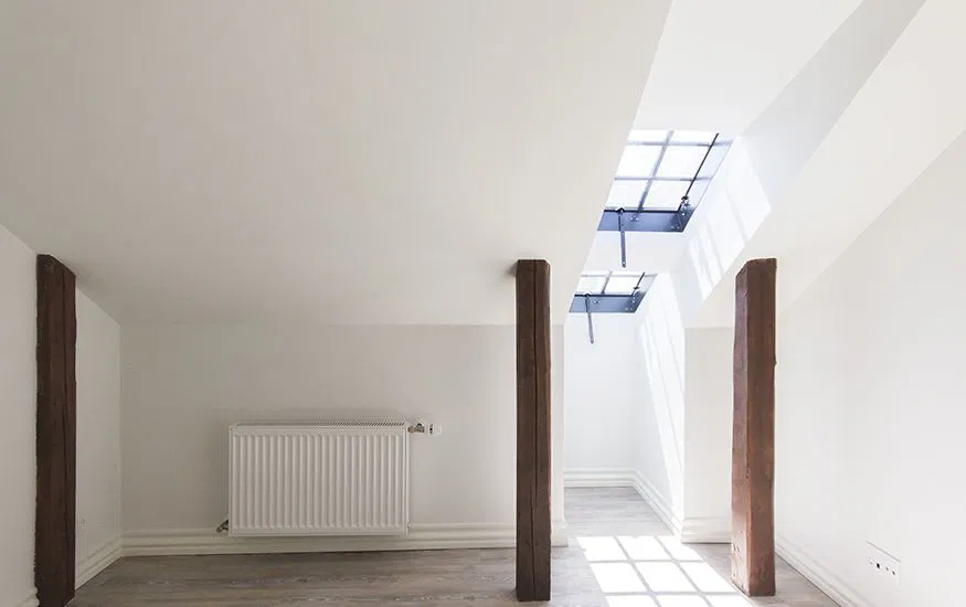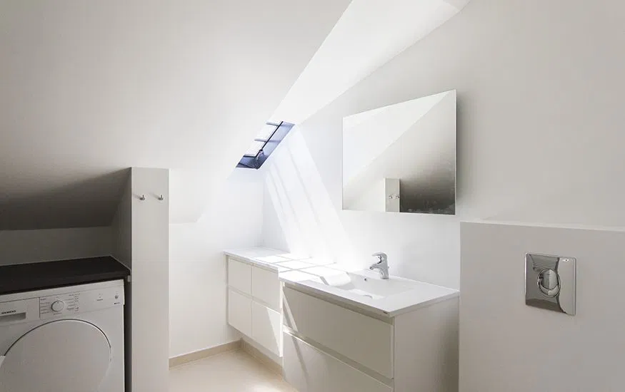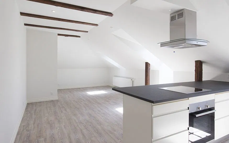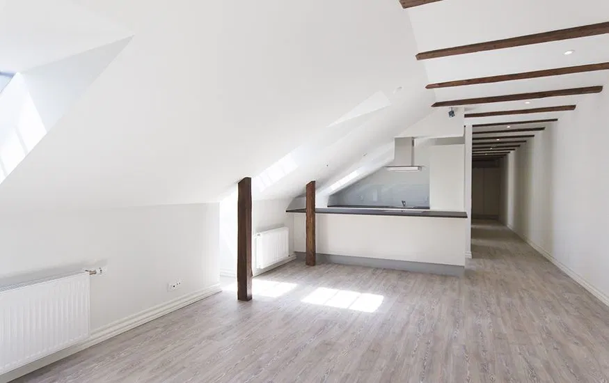 Lejligheden byder på skråvægge, synlige spær og fine ovenlys, der skaber et behageligt lysindfald. Planløsningen rummer et stort, åbent køkken/alrum og stue i ét samt et rummeligt soveværelse. De lyse gulve og hvide vægge giver et moderne præg, og de diskrete spotlights i loftet tilføjer en ekstra dimension til rummene.