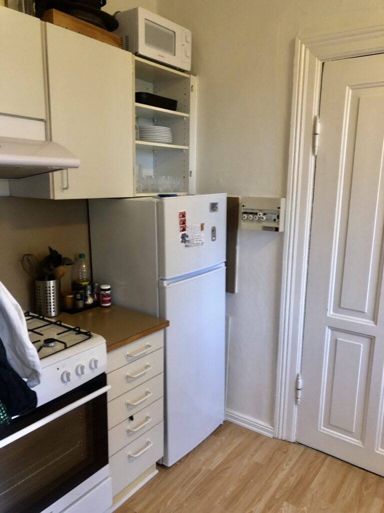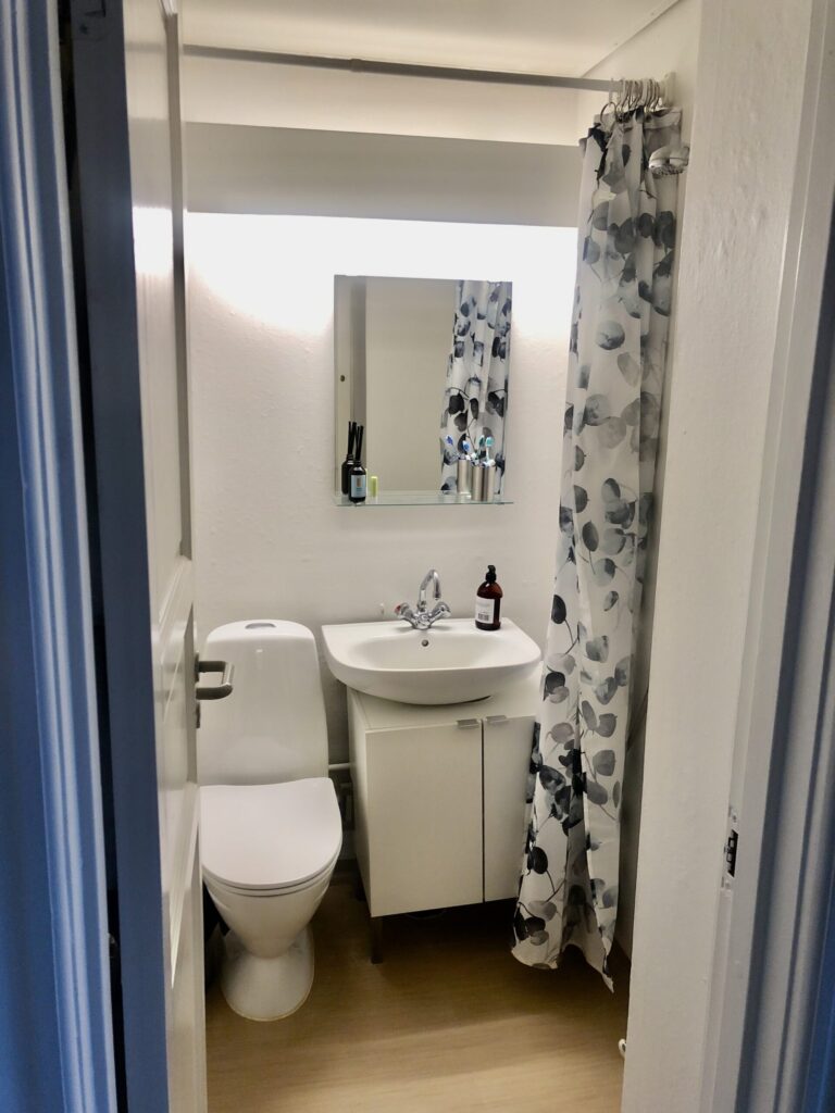 Lejlighedens badeværelse er med en indsat bruser, der dog er rimelig godt skærmet af, så det ikke føles som bad oveni toilettet. Her er også indsat et skab, hvor du kan gemme dine badeværelsessager væk.
