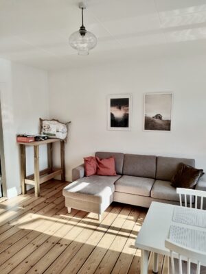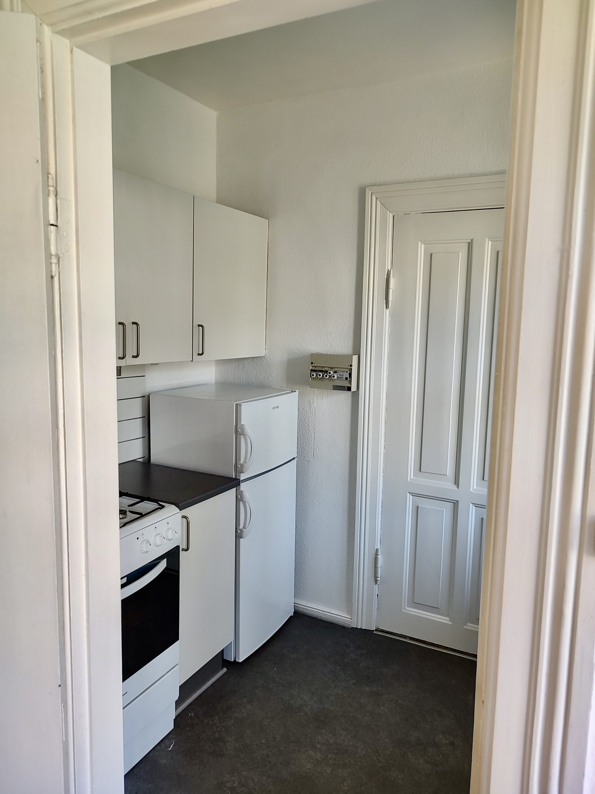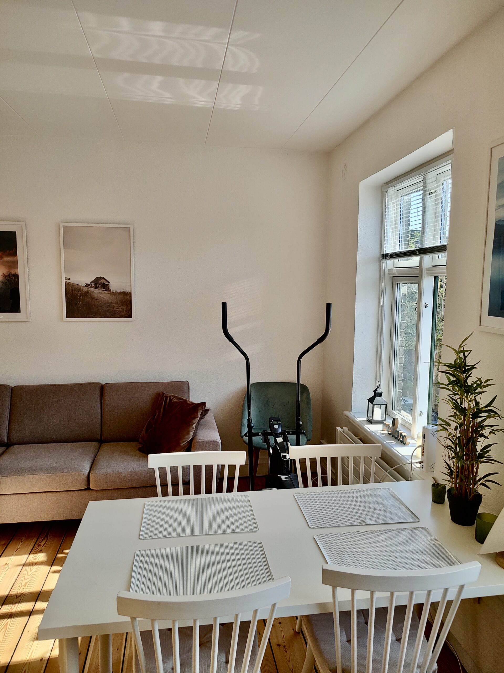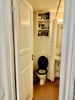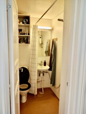 Lejlighedens badeværelse er med en indsat bruser, der dog er rimelig godt skærmet af, så det ikke føles som bad oveni toilettet. Her er også indsat et skab, hvor du kan gemme dine badeværelsessager væk.