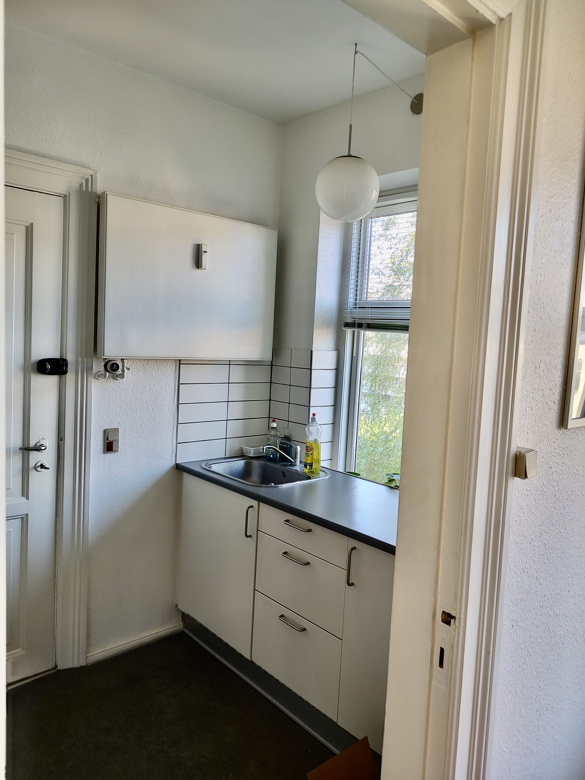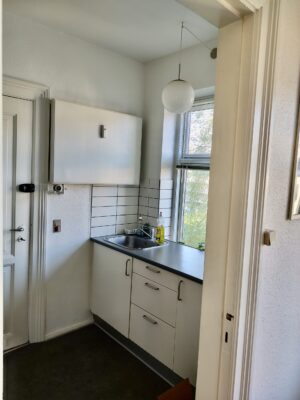 Køkkenet er nyere, og har nogle fine materialer og der er fra vinduet en flot udsigt til gårdhaven.