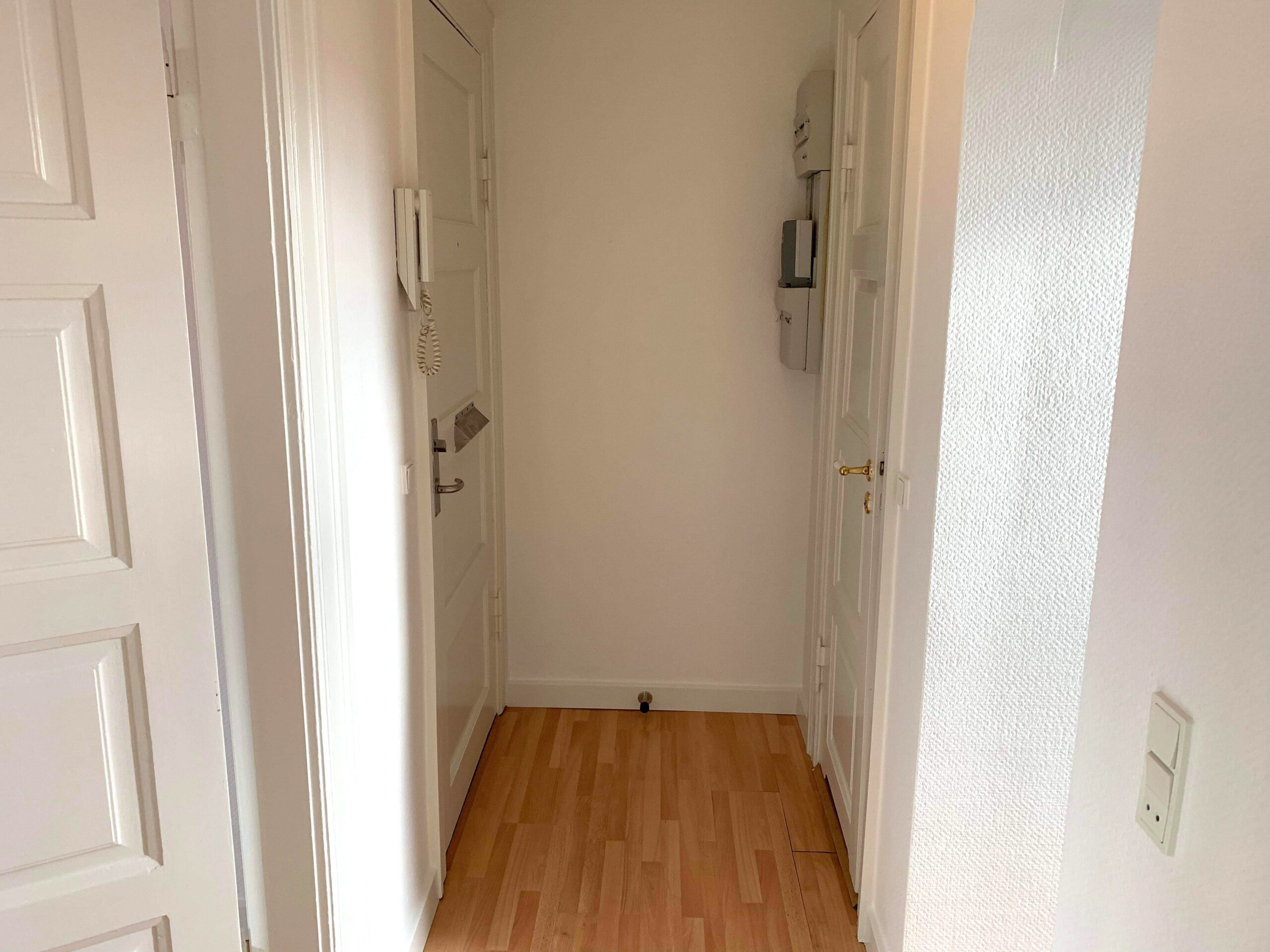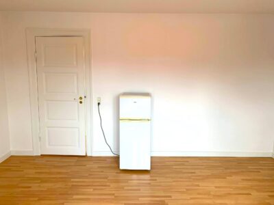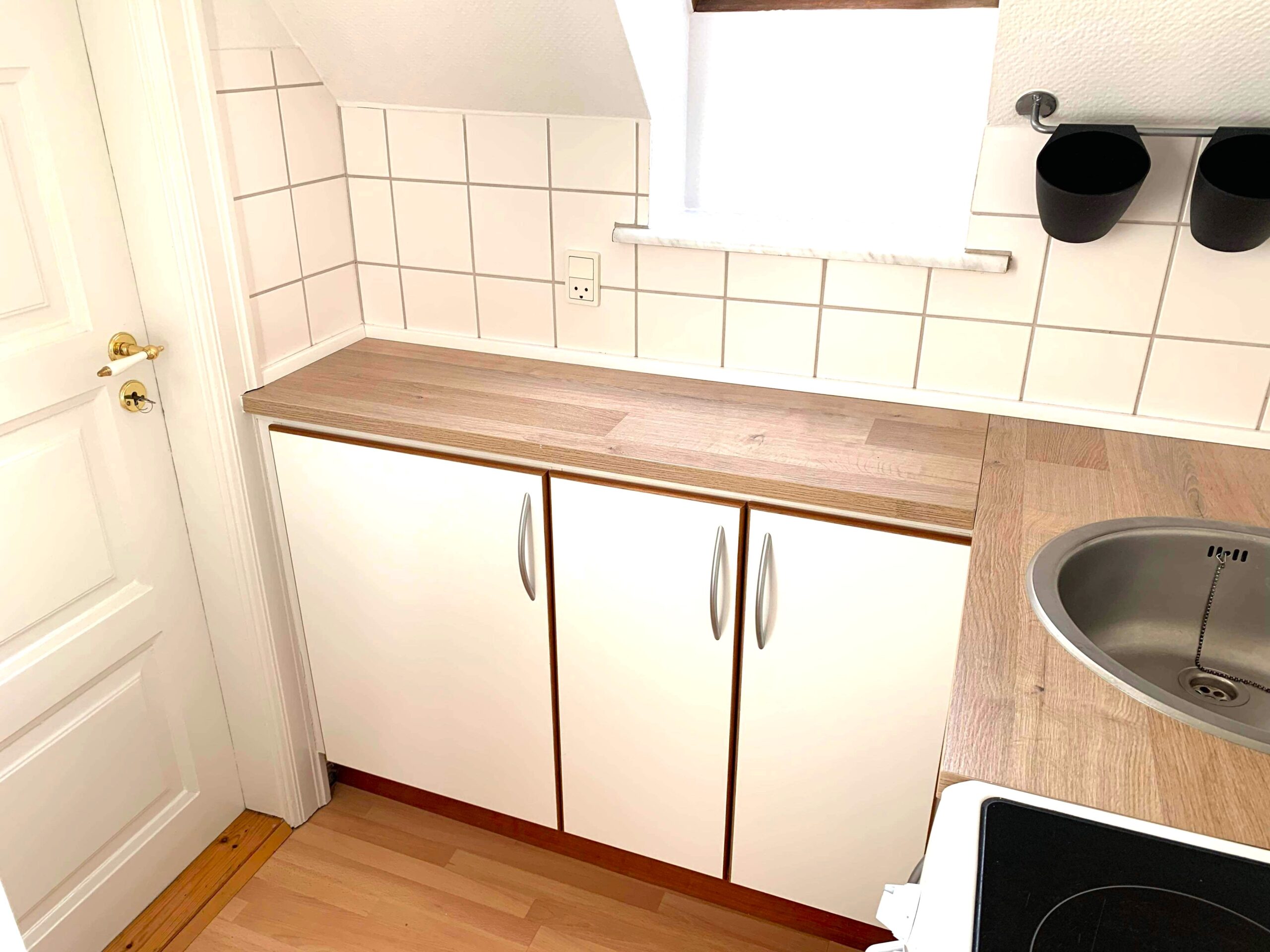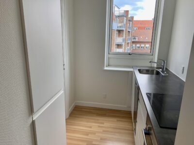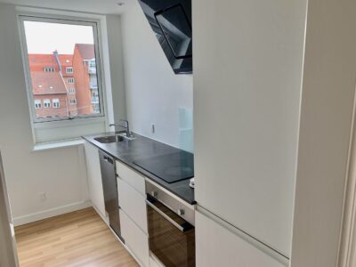 Det moderne køkken er udstyret med alt, hvad du behøver for madlavning og opbevaring. Her finder du en ovn, komfur, emhætte samt et praktisk køle-fryseskab. De lyse og flotte gulve i hele lejligheden tilføjer en lys og indbydende atmosfære.