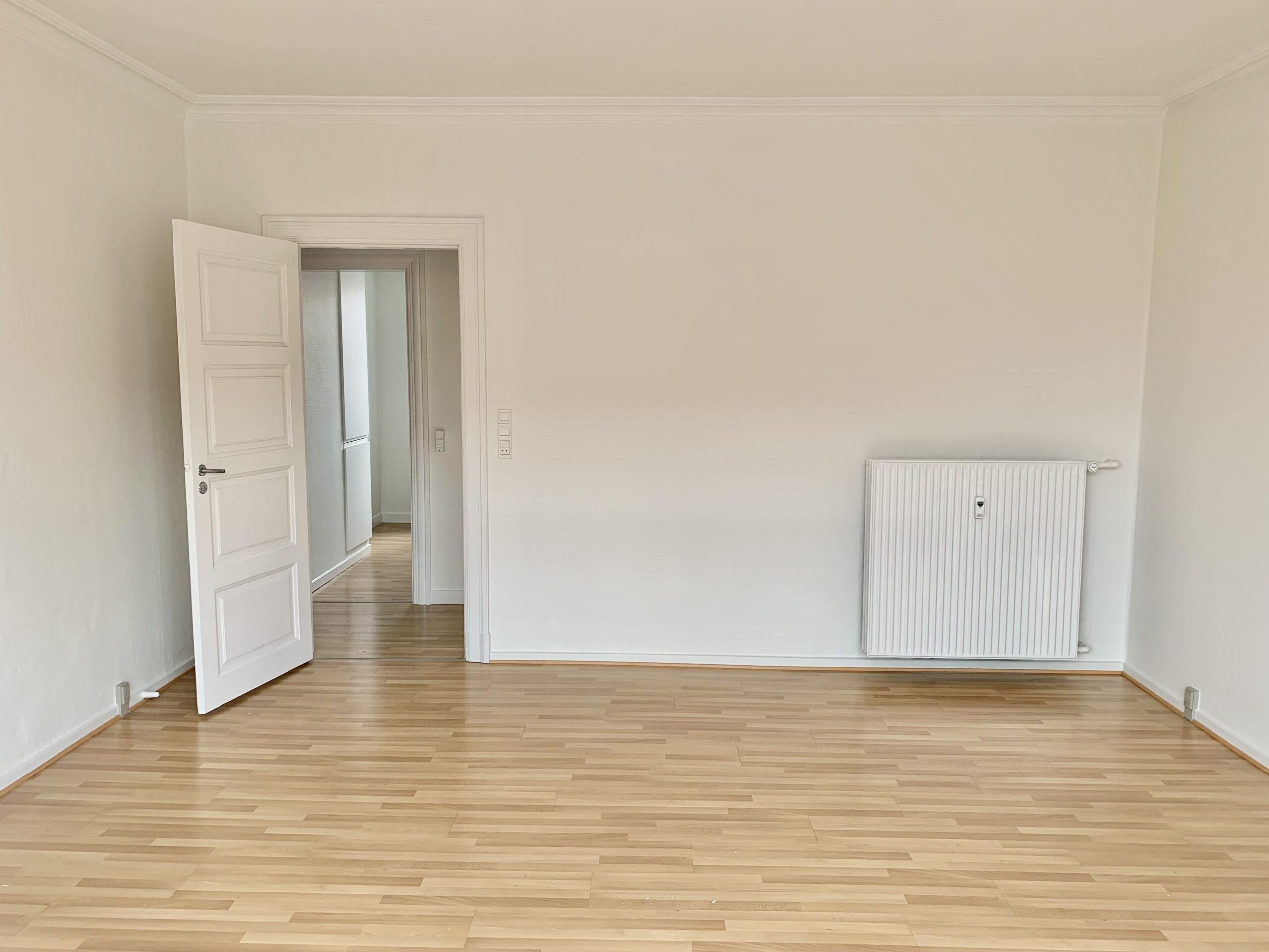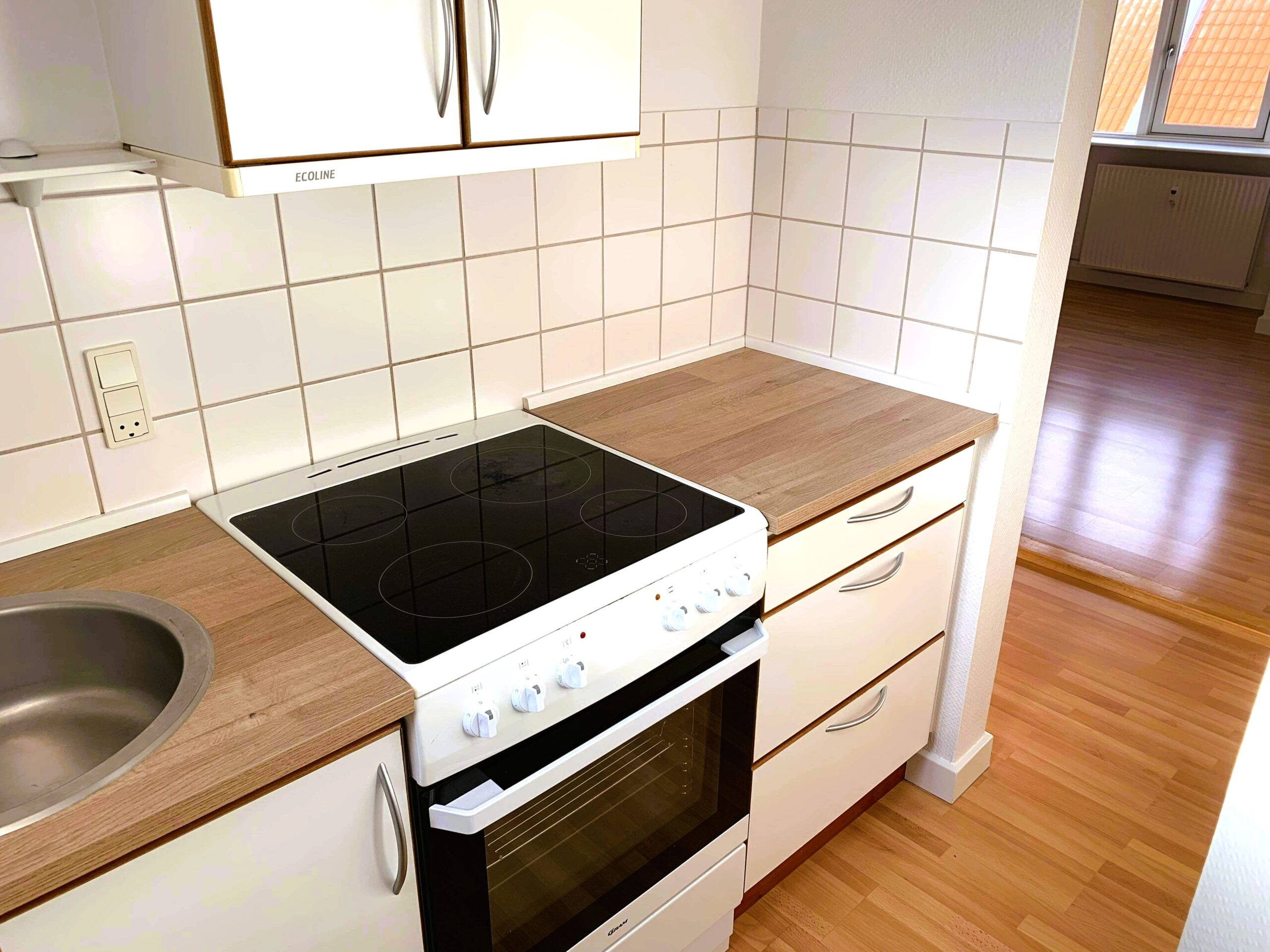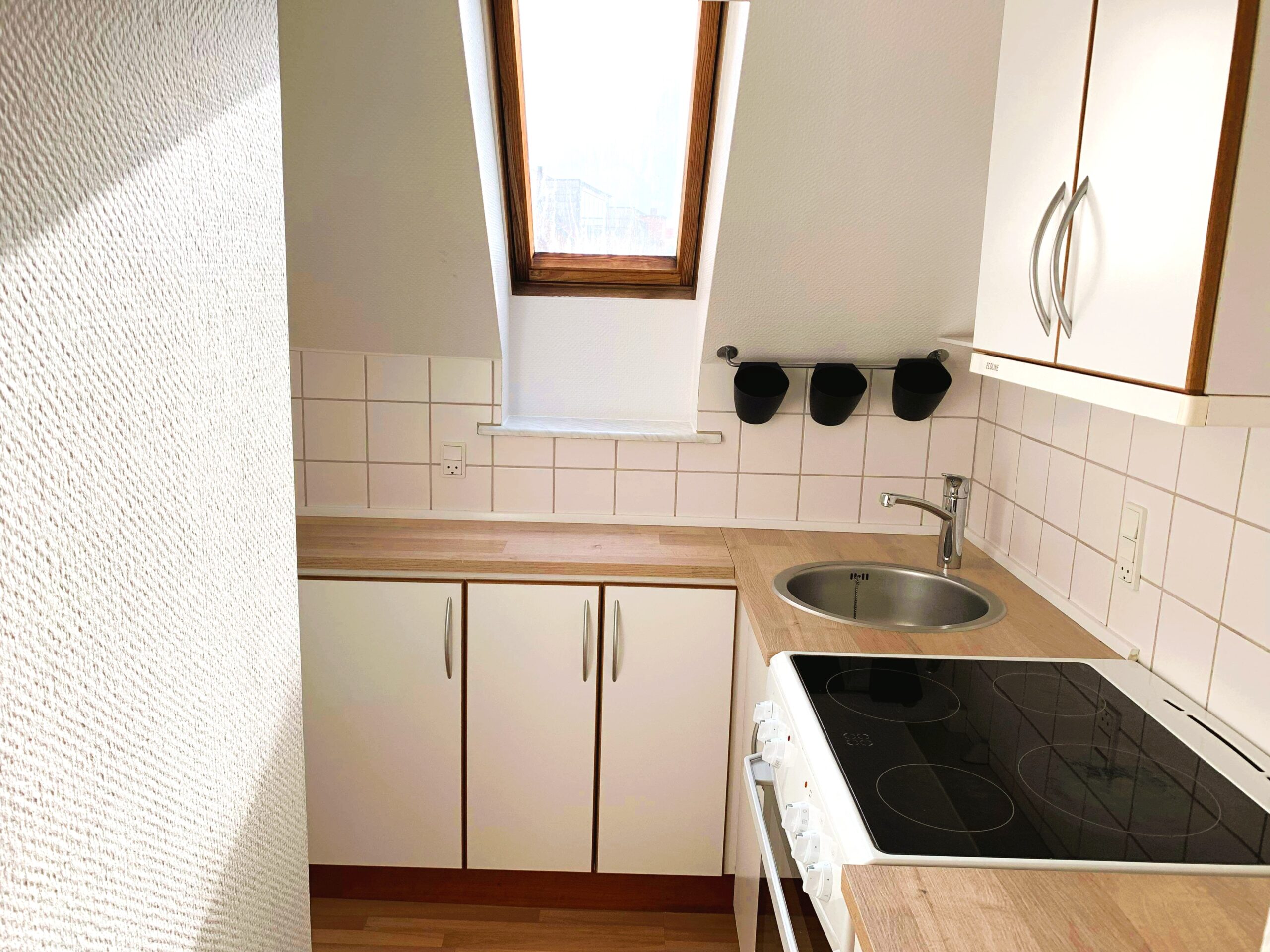 Det moderne køkken er udstyret med alt, hvad du behøver for madlavning og opbevaring. Her finder du en ovn, komfur, emhætte samt et praktisk køle-fryseskab. De lyse og flotte gulve i hele lejligheden tilføjer en lys og indbydende atmosfære.