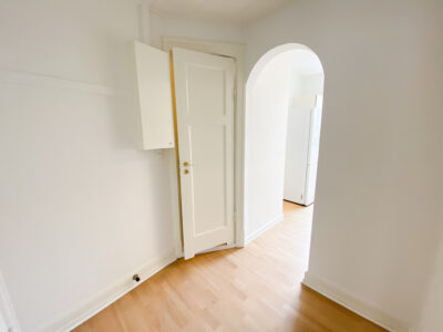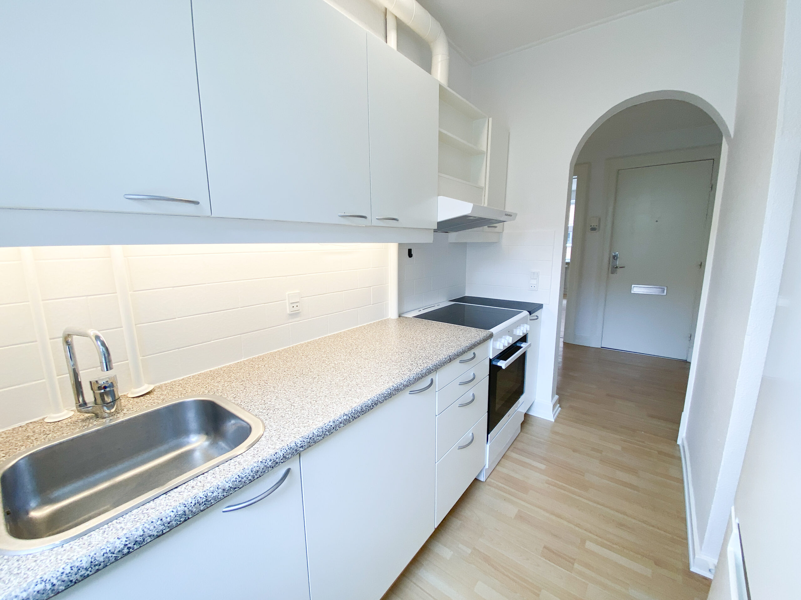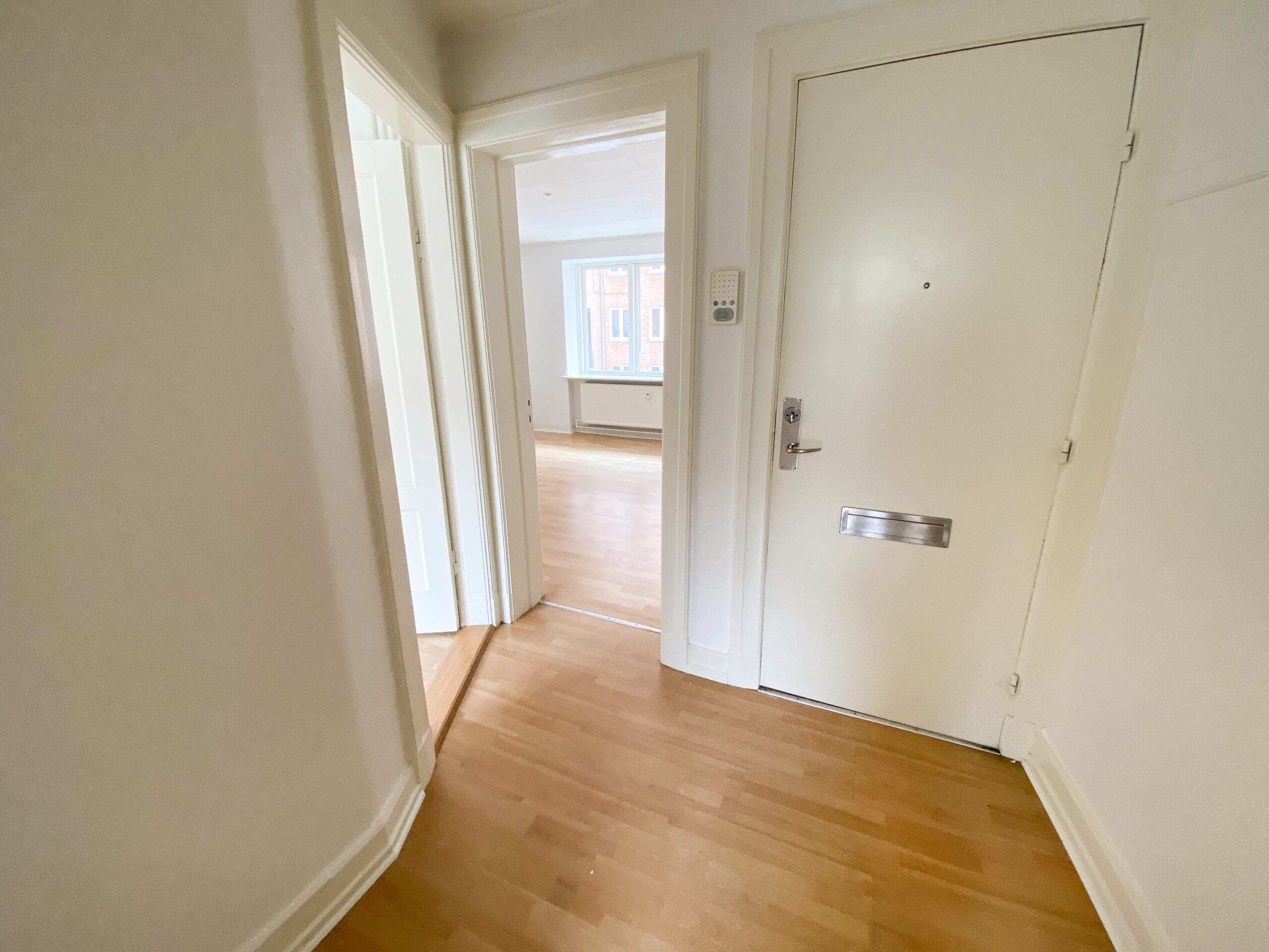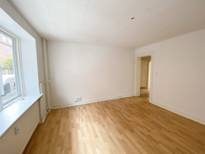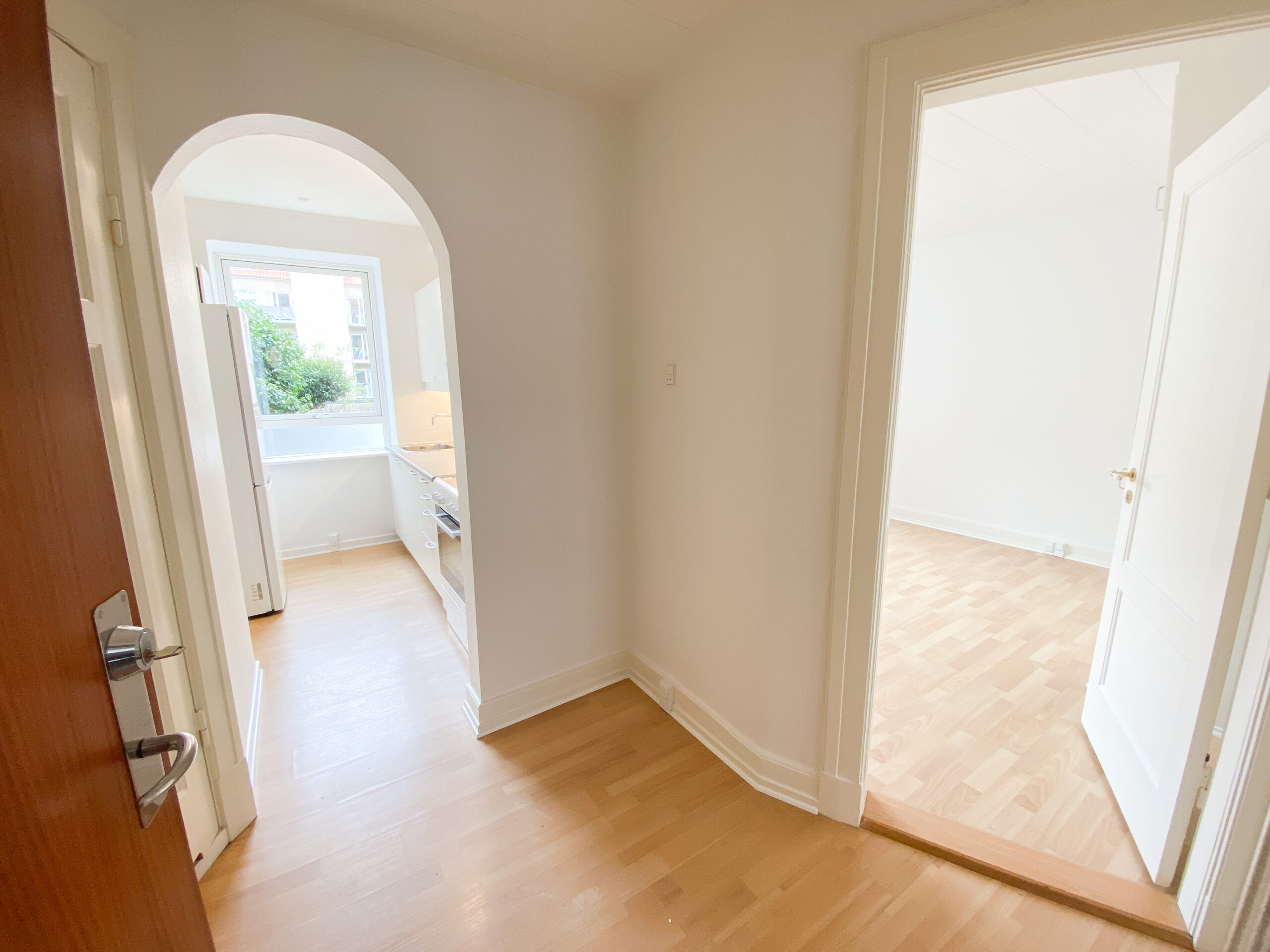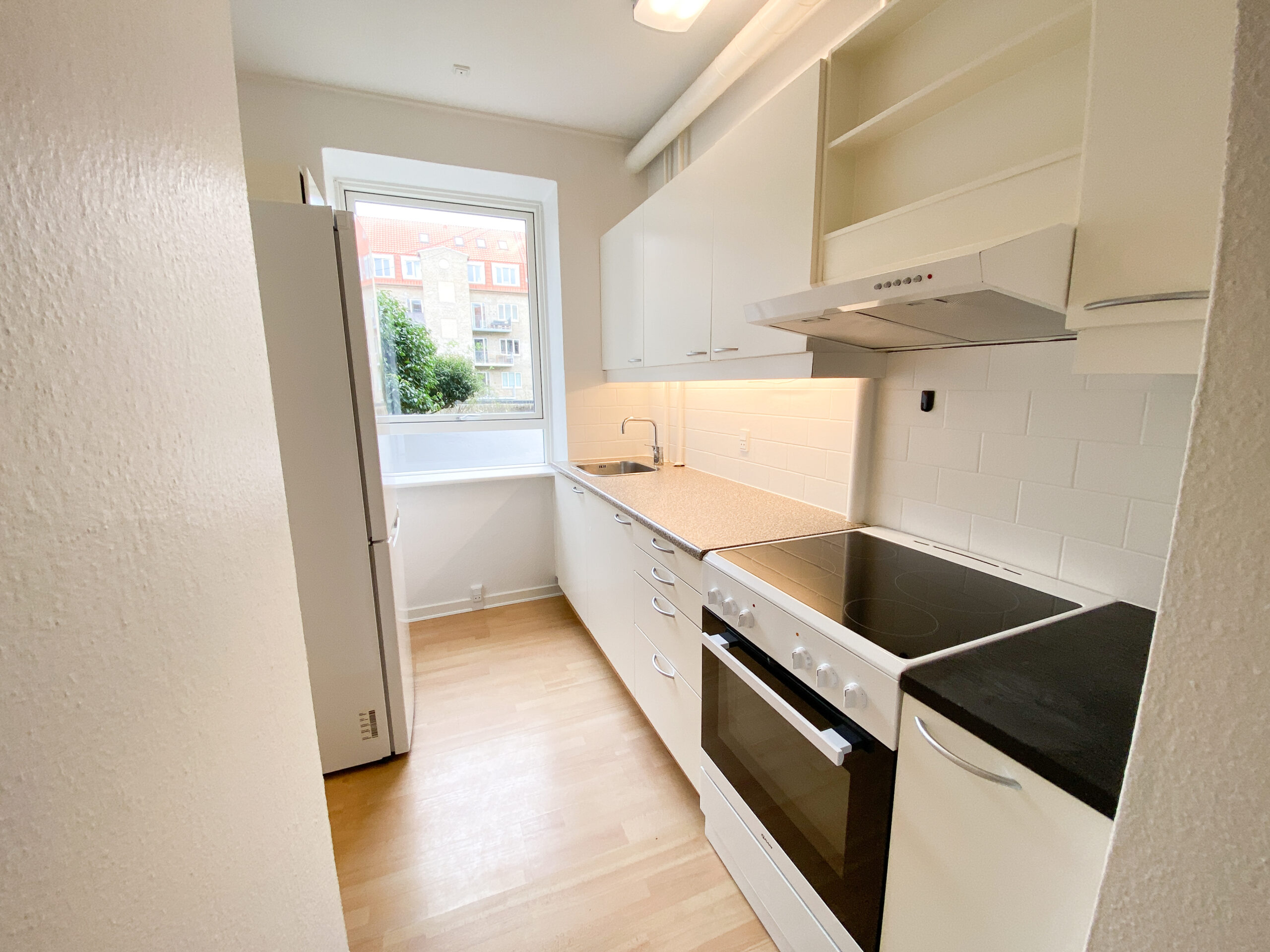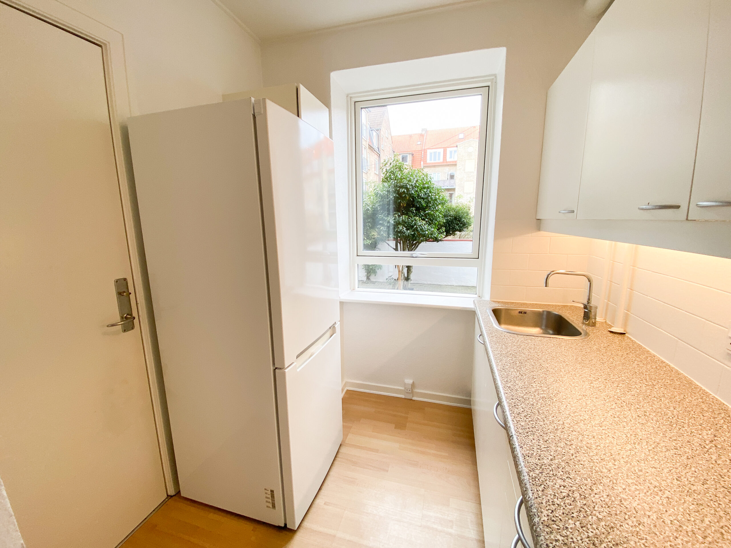 Lejligheden har en lys og rummelig stue med plads til både sofa- og spiseafdeling. Soveværelset vender ud mod den stille gård og er indrettet med et stort klædeskab, som giver god opbevaringsplads. Køkkenet fremstår pænt og praktisk med komfur, emhætte og køleskab – og der er mulighed for, at en helt ny opvaskemaskine kan blive monteret inden overtagelse. Badeværelset er funktionelt med toilet, separat bruseniche i hjørnet og nyere inventar.