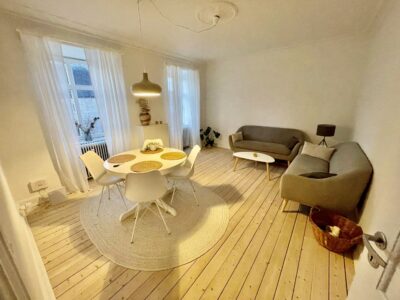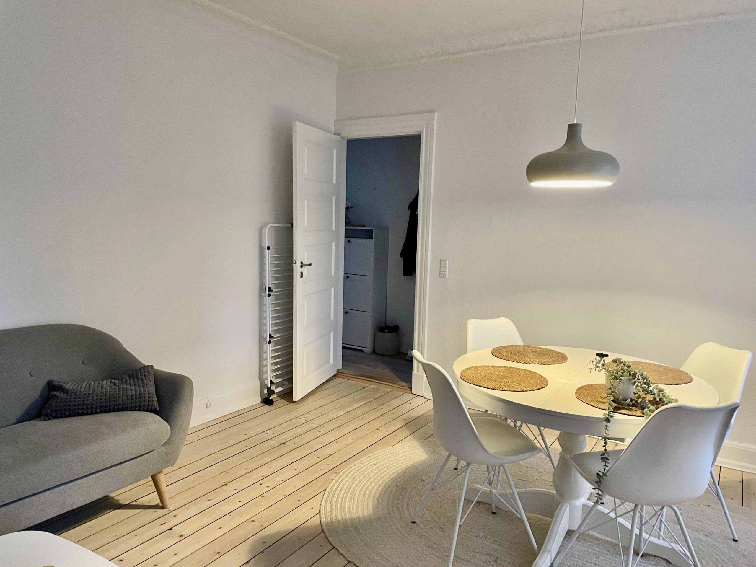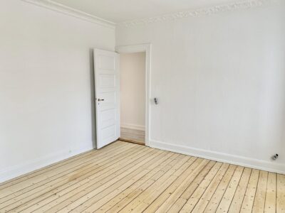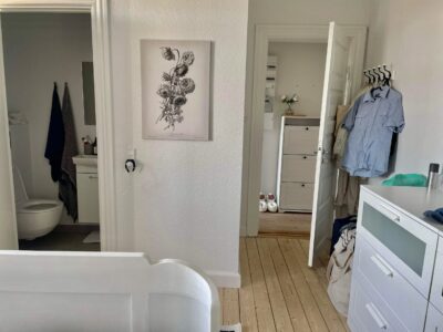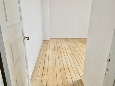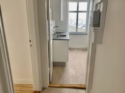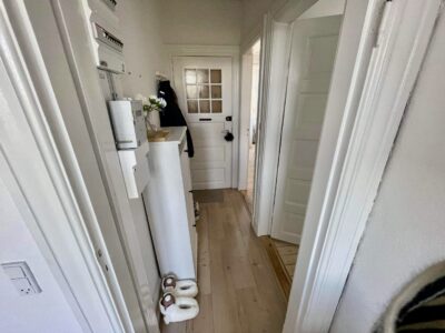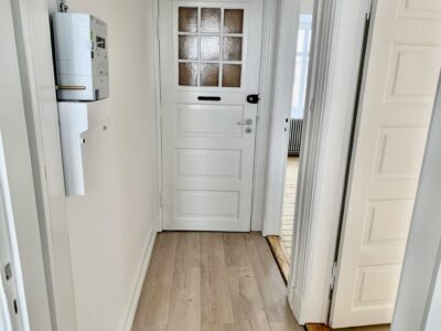 Når man træder ind i lejligheden kommer man ind i en fordelingsgang, hvor der lige er plads til noget entré areal. Til venstre for sig har vi stuen. Der er flot udsigt til Sankt Markus kirken.