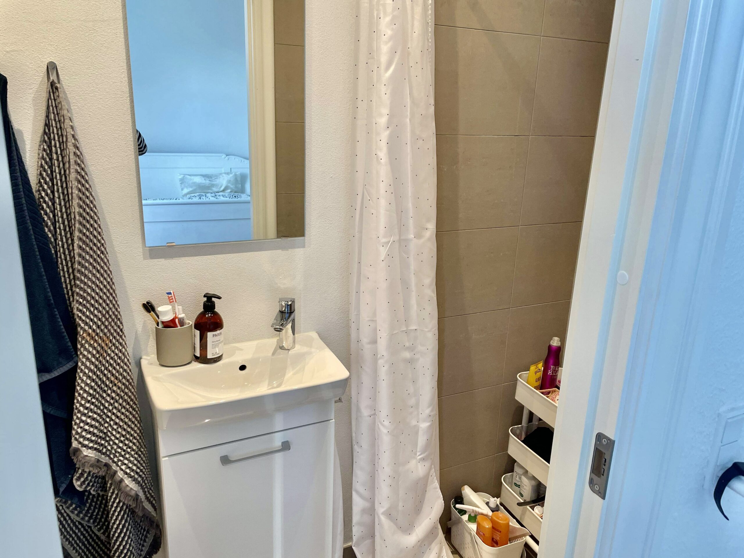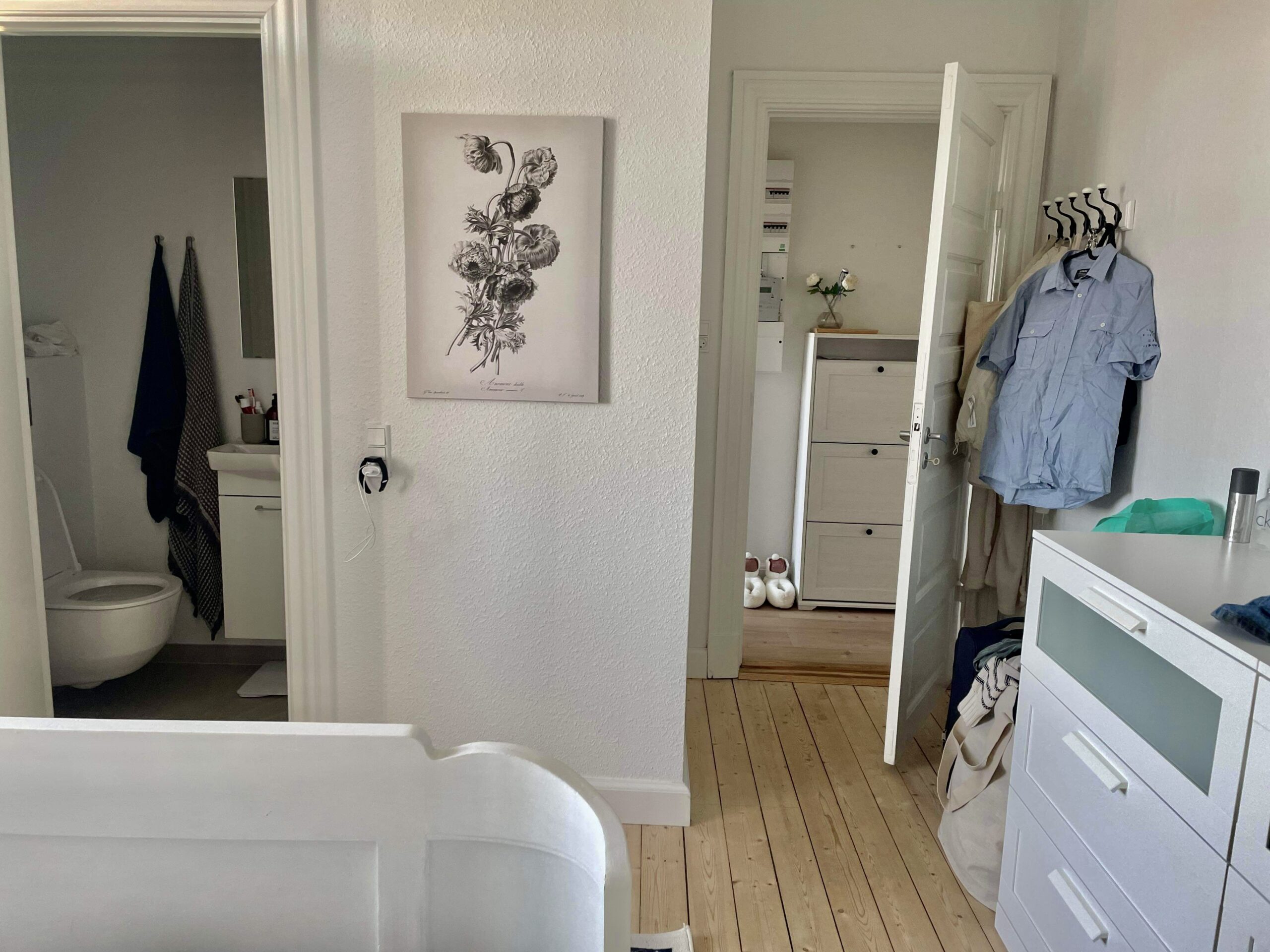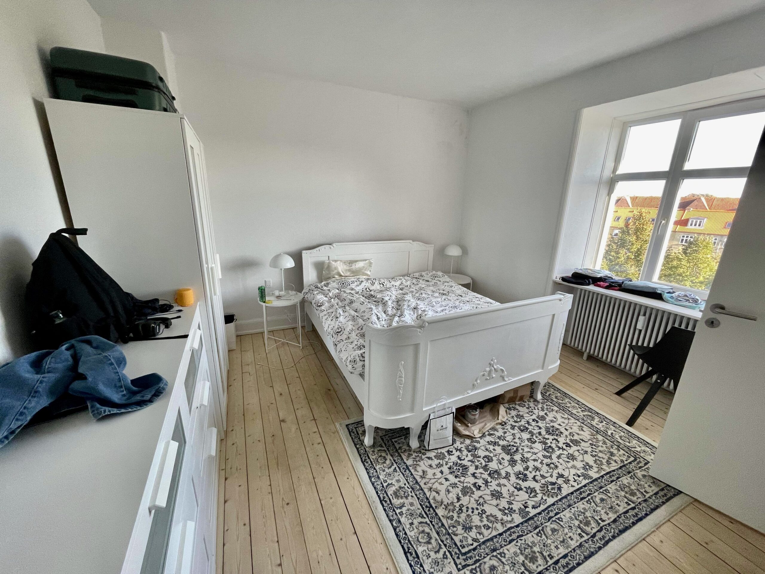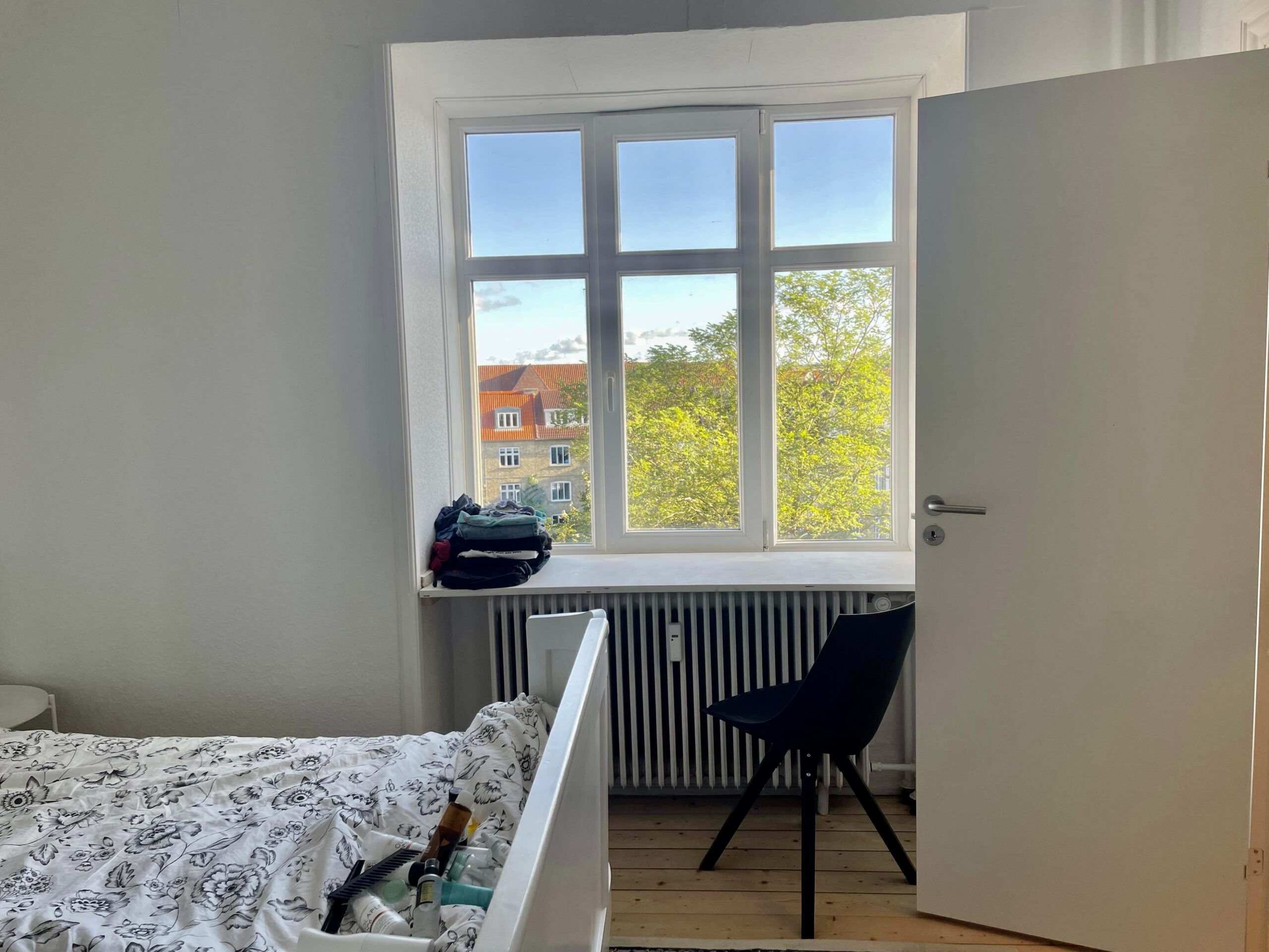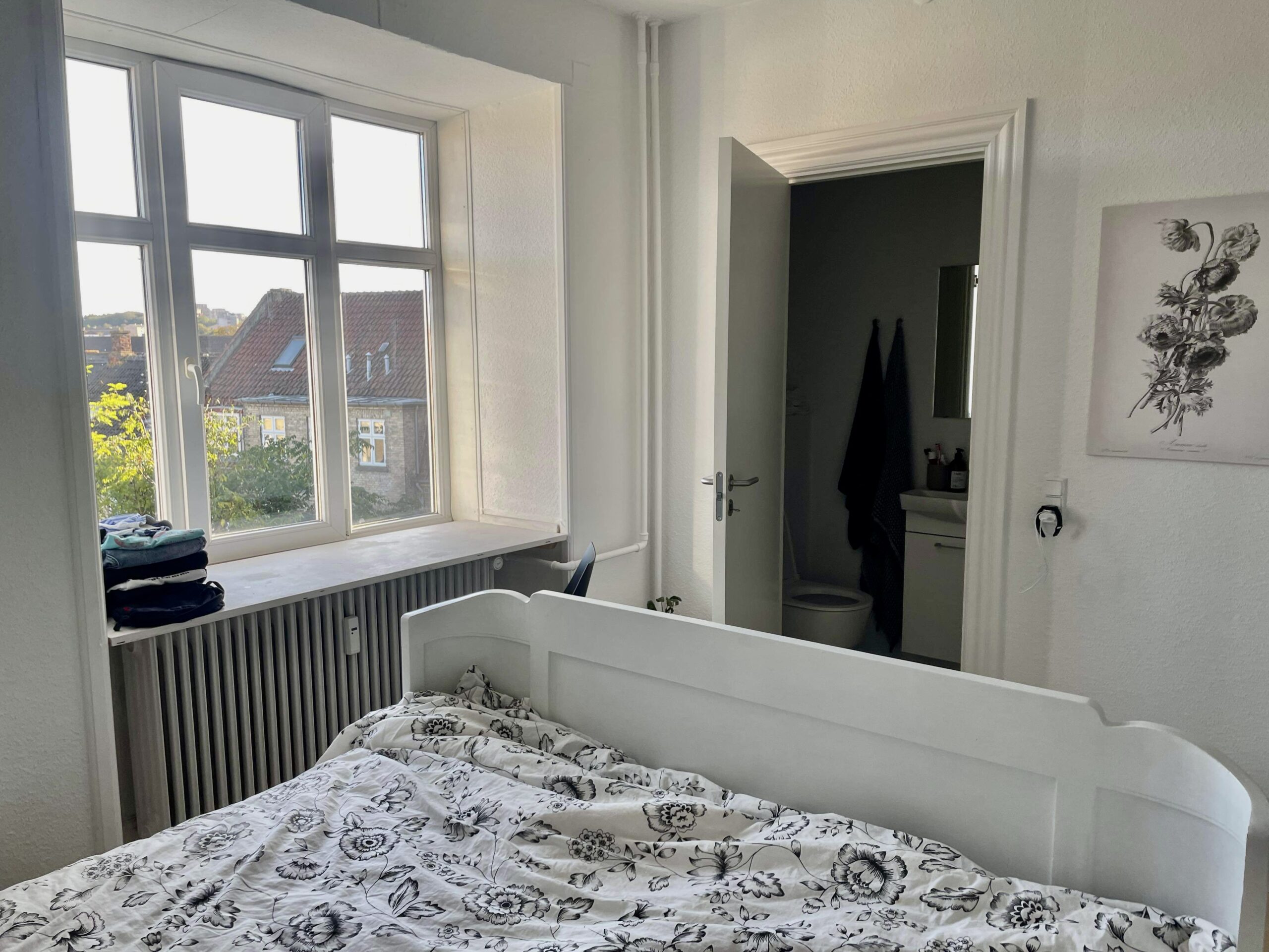 Til slut har vi soveværelset. Det er også super fint med udsigt til gårdhaverne i nærheden. Det er herfra at der er udgang til badeværelset. Man har lavet et rum kun til formålet. Det hele er nyt og flot.