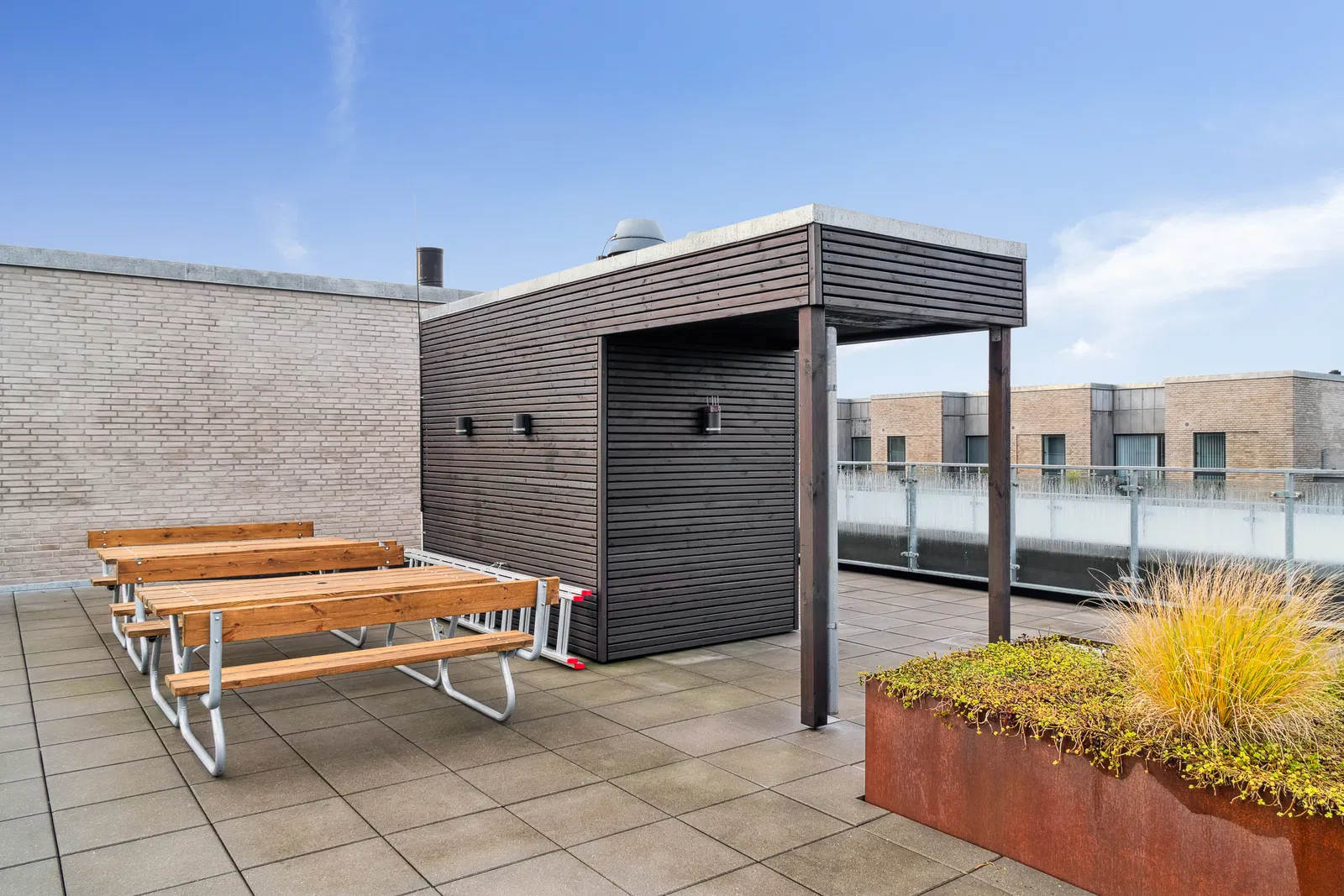 Her får du adgang til en række gode fællesfaciliteter, herunder en elevator og en stor fælles tagterrasse med opholdspladser, hvor du kan slappe af med naboerne. Der er også et aflåst cykelrum, og parkering er tilgængelig efter først-til-mølle-princippet.