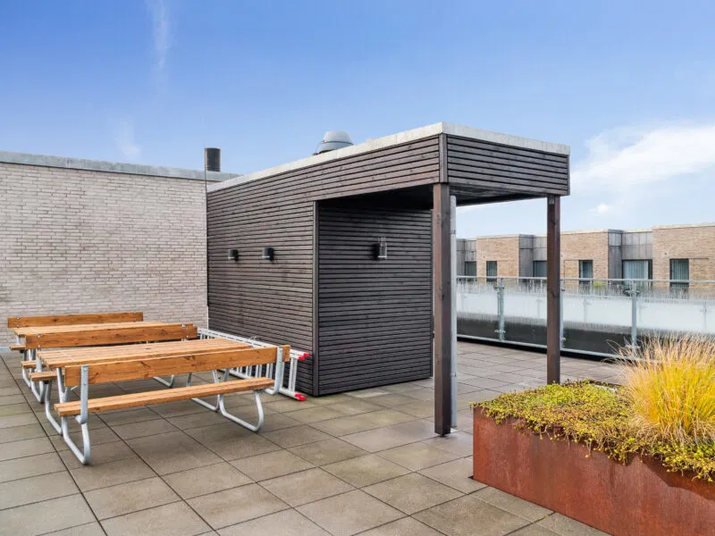 Ejendommen tilbyder yderst attraktive fællesfaciliteter, inklusive en stor fælles tagterrasse med betagende udsigt, en elevator samt et stort aflåst cykelrum. Der er parkering efter først-til-mølle-princippet, og der er mulighed for at leje en garage eller carport.