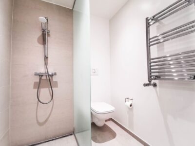 Badeværelset er flot flisebelagt på både gulv og i bruseniche. Her finder du også et praktisk vaskearrangement med underskab og spejl, samt faciliteter som håndklæderadiator, vaskemaskine og tørretumbler – alt, hvad du behøver for en nem og funktionel hverdag.