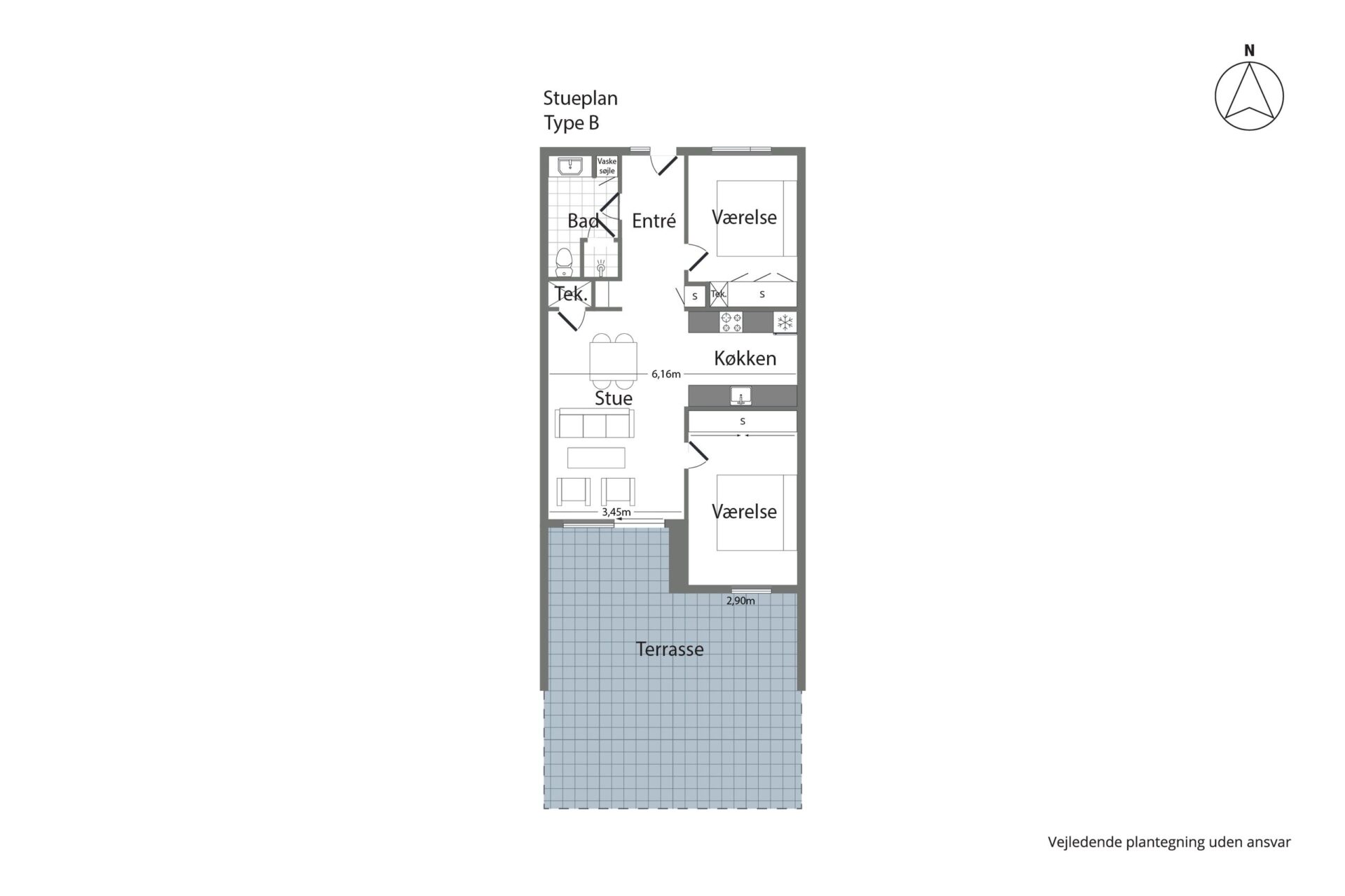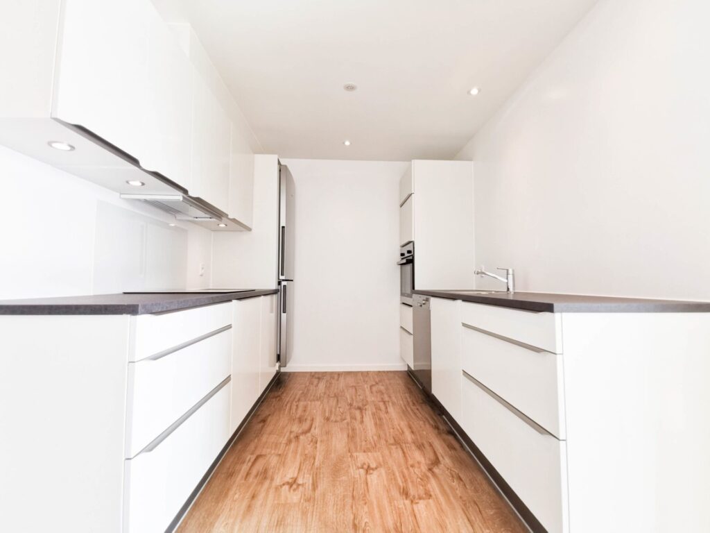 Denne moderne lejlighed byder på et velindrettet køkken fra HTH, der er udstyret med alt i hårde hvidevarer, herunder køle-/fryseskab, induktionskogeplade, emhætte, indbygningsovn og opvaskemaskine – perfekt til den, der ønsker funktionalitet og stil i køkkenet.