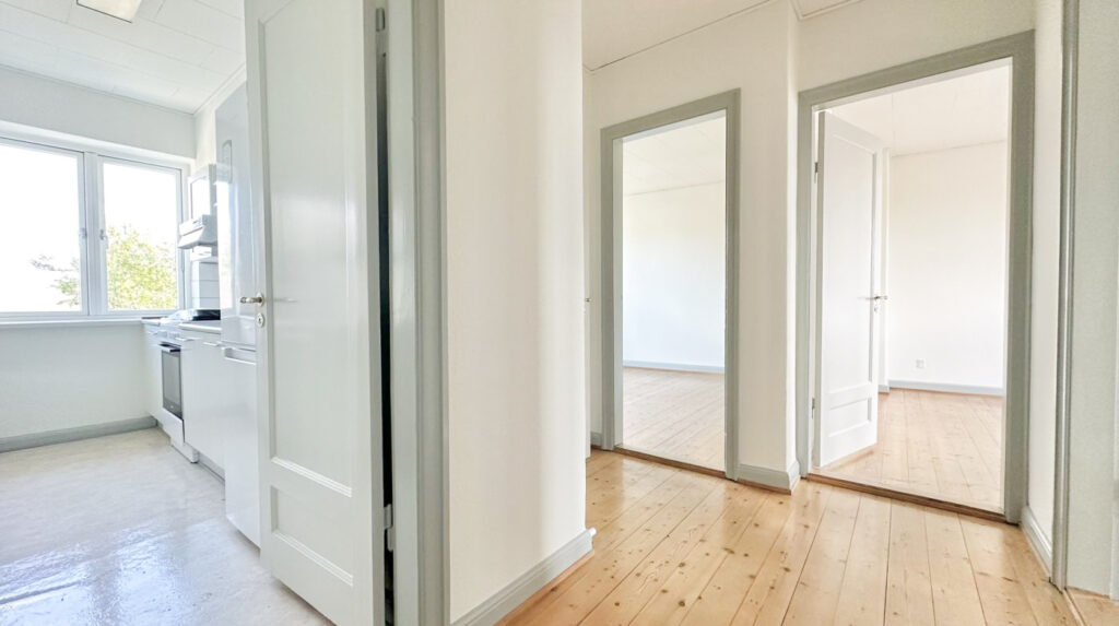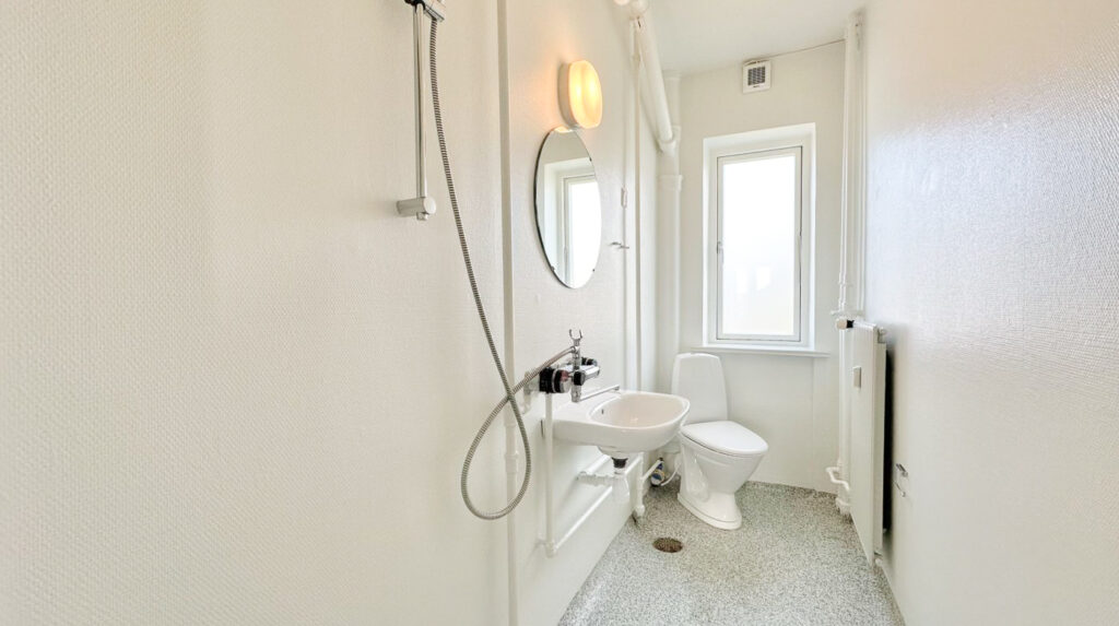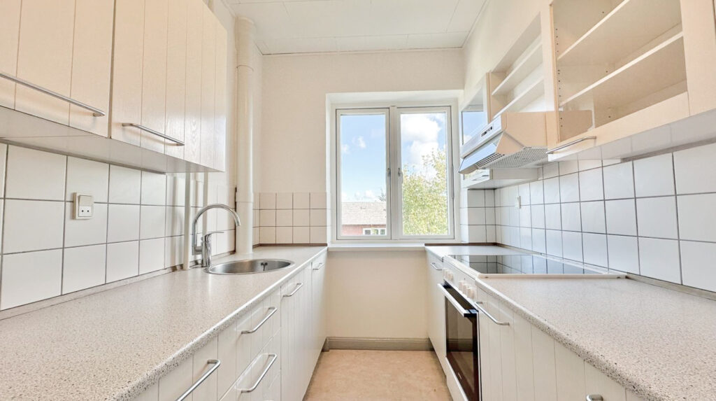 Lejligheden byder på et flot hvidt køkken, udstyret med moderne hårde hvidevarer, der gør madlavningen til en fornøjelse. Det funktionelle badeværelse har bruser og er praktisk indrettet.