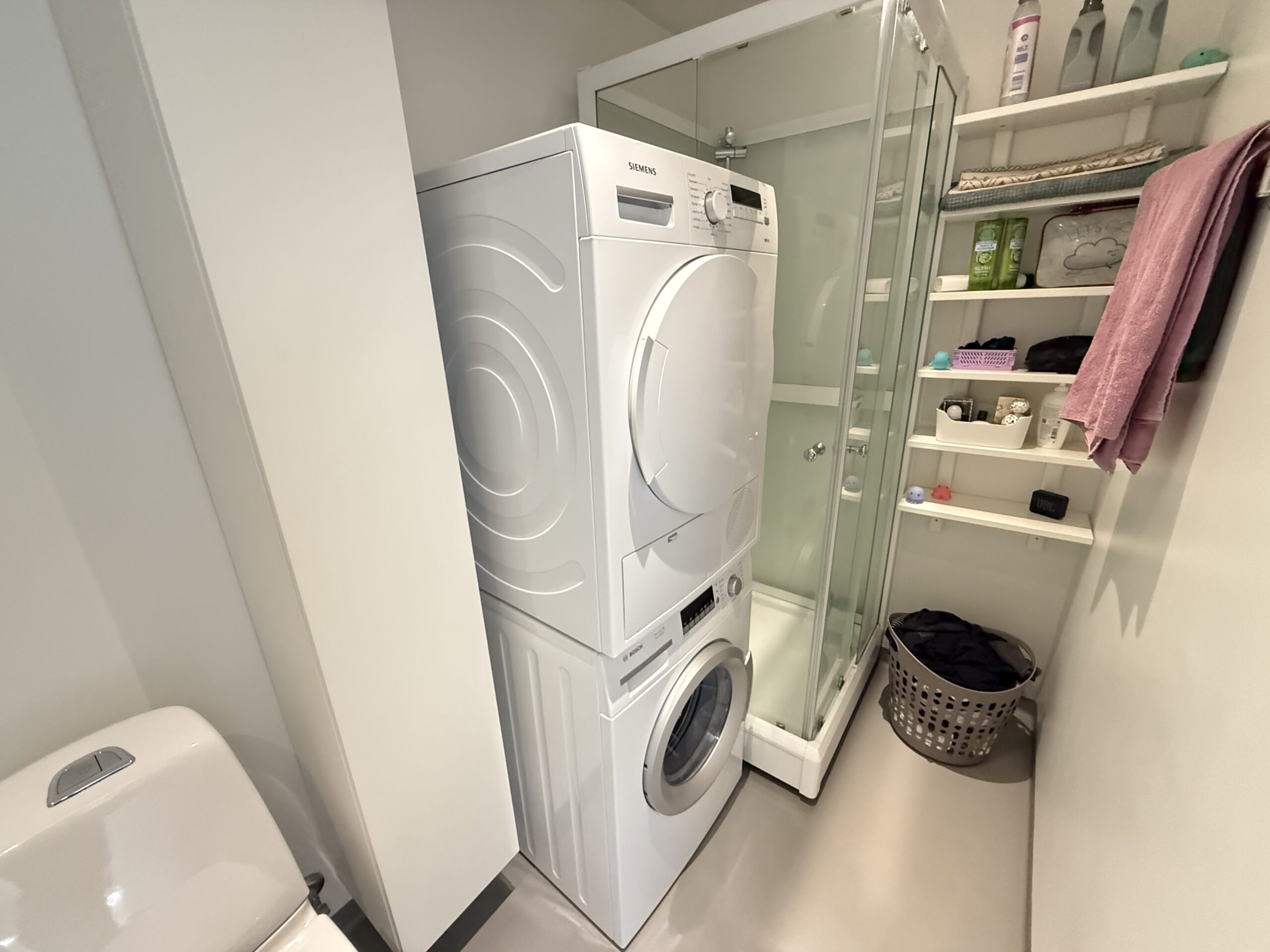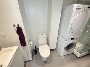 Det effektive køkken er udstyret med de nødvendige moderne apparater, og der er masser af bordplads til at udfolde dine kulinariske evner. Badeværelset er elegant indrettet med en vaskemaskine og tørretumbler, så du har alle bekvemmeligheder lige ved hånden.