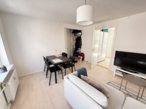Denne renoverede perle tilbyder alt, hvad du behøver indenfor 54 kvadratmeter. Når du træder ind, bliver du mødt af en indbydende stue og spiseområde med masser af naturligt lys fra de store vinduer.